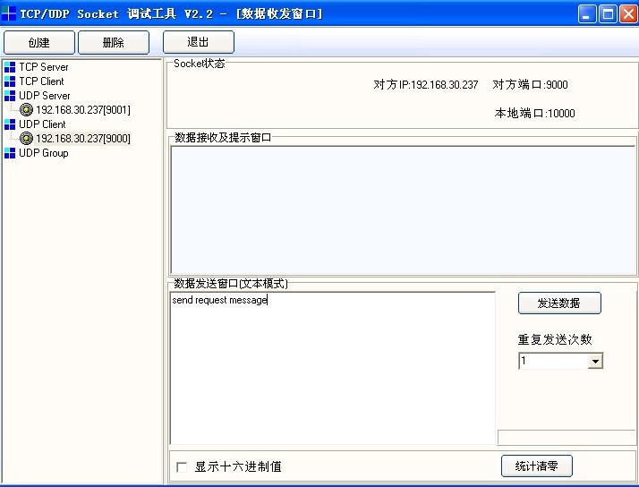 2.在UDP Client窗口发送请求,UDP Server窗口会接收到相应信息,如下图所示。