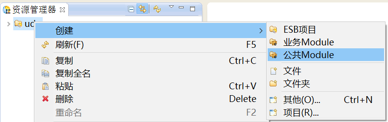在资源管理器中,选中创建好的项目,鼠标右键选择“创建 > 公共Module”,创建公共Module,如下图所示。