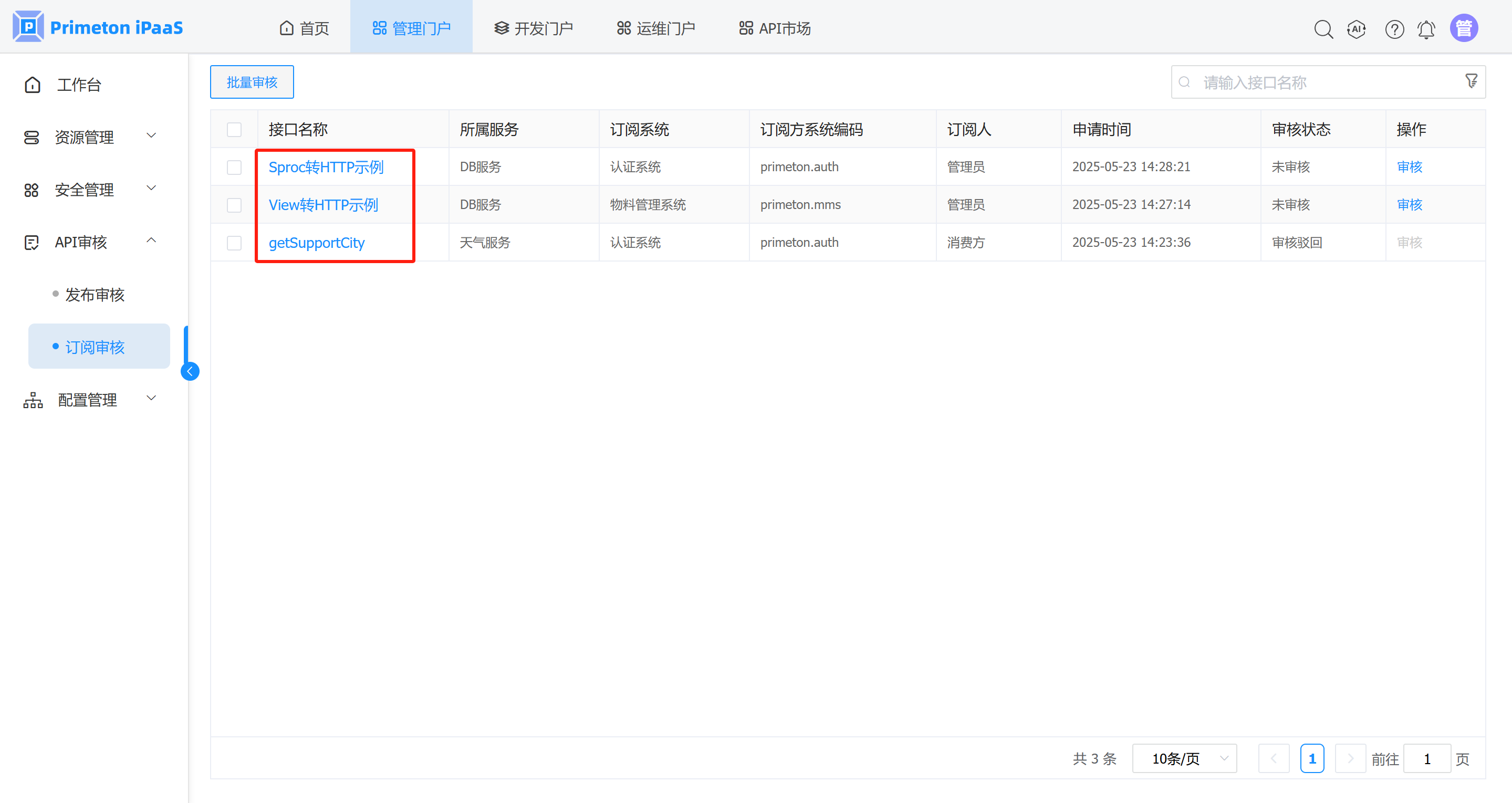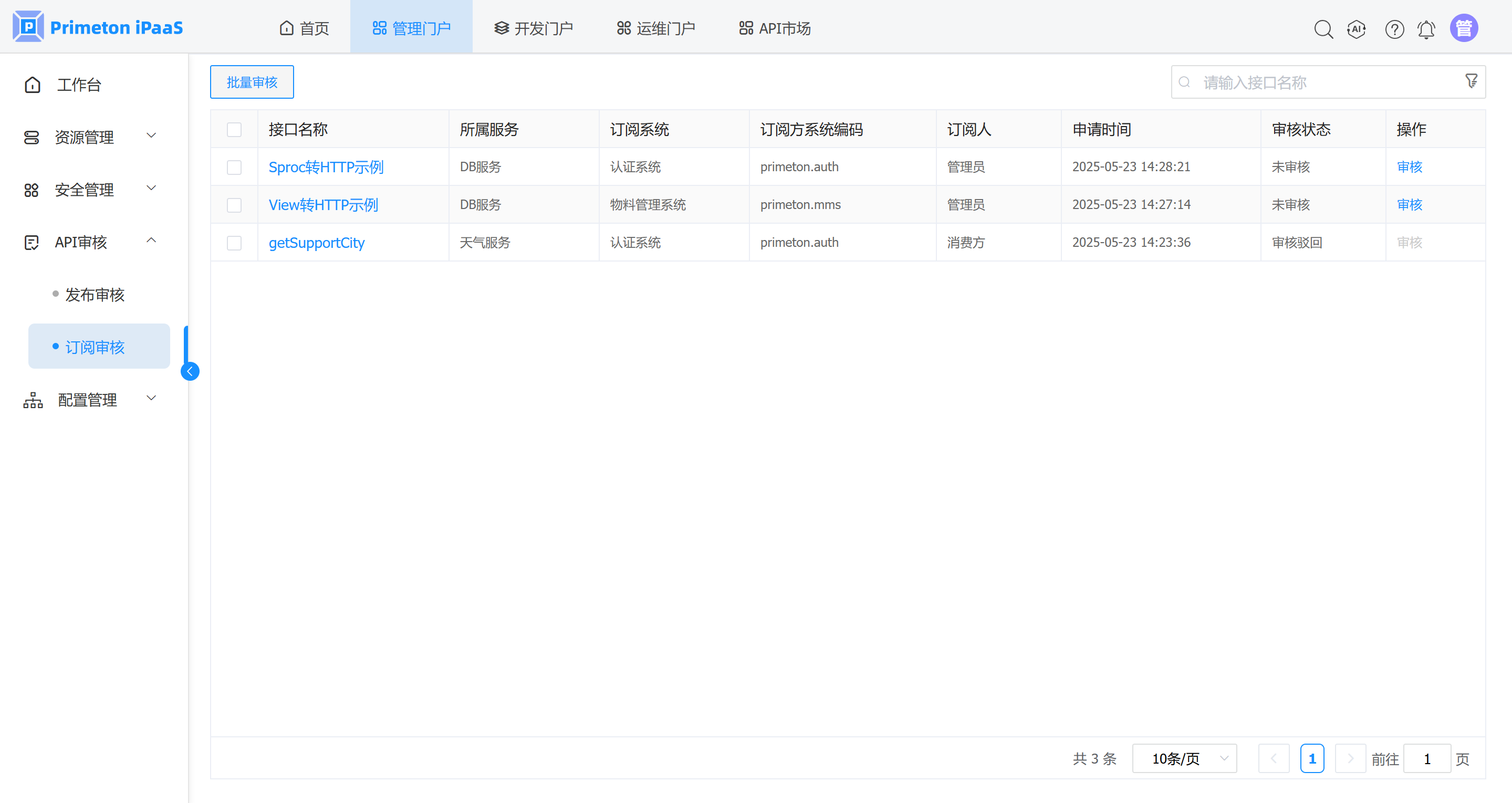 消费方在API门户订阅接口,需要先经过管理人员审核,只有审核通过后,消费方才能使用已订阅的接口。