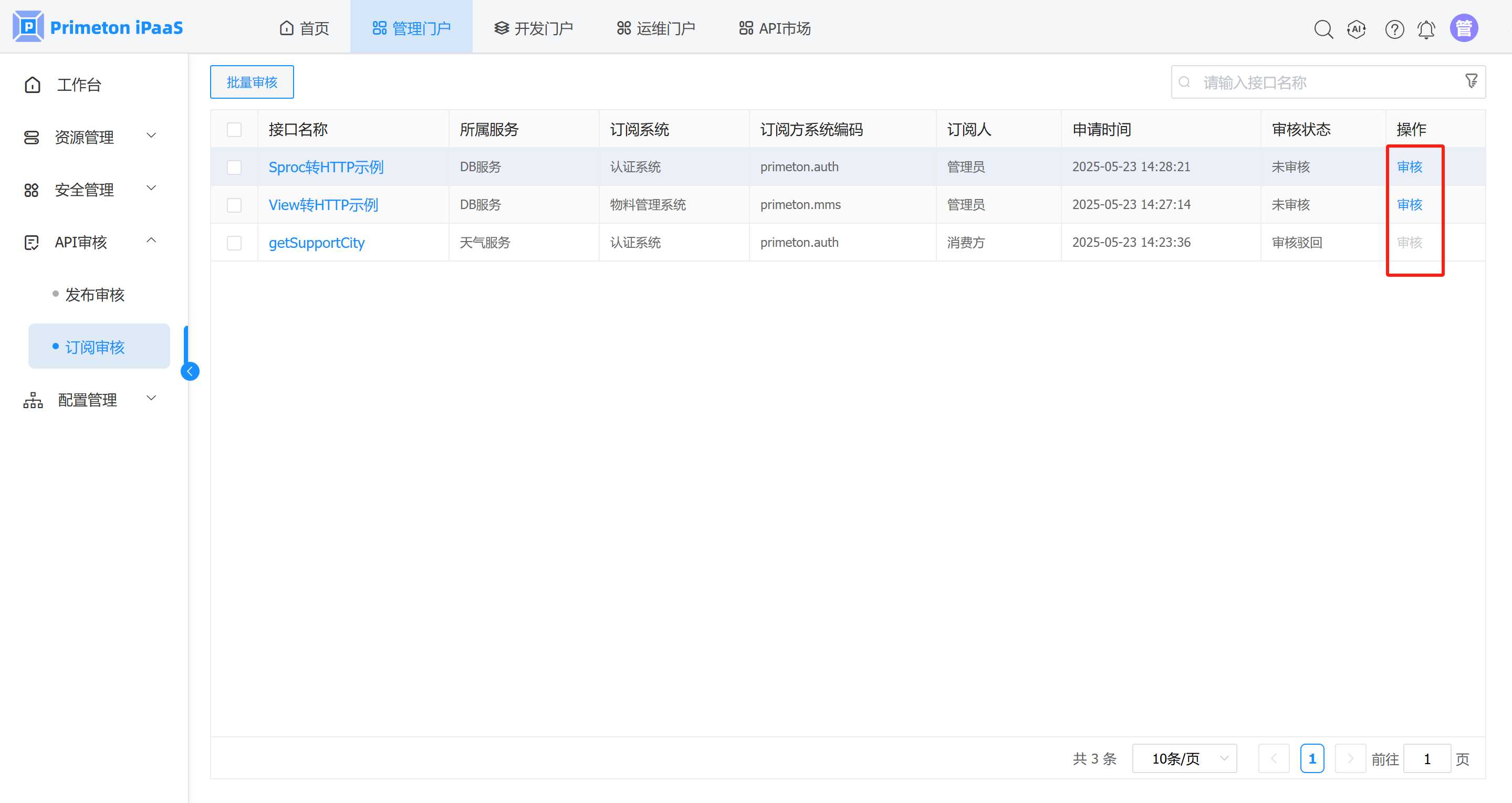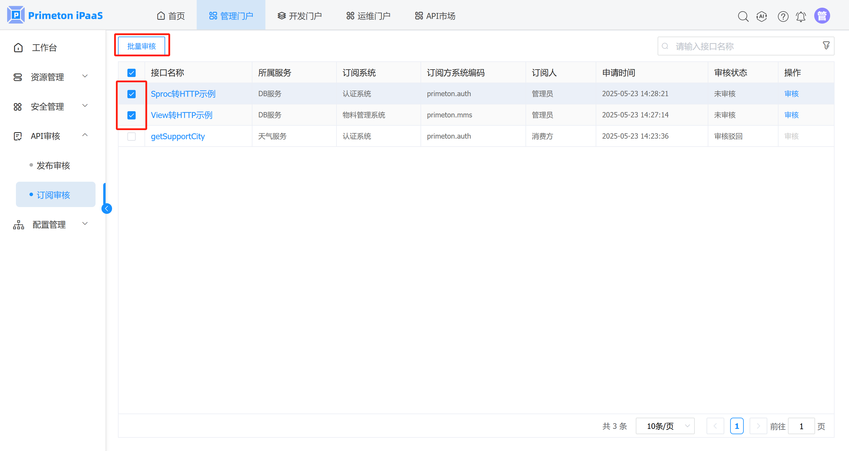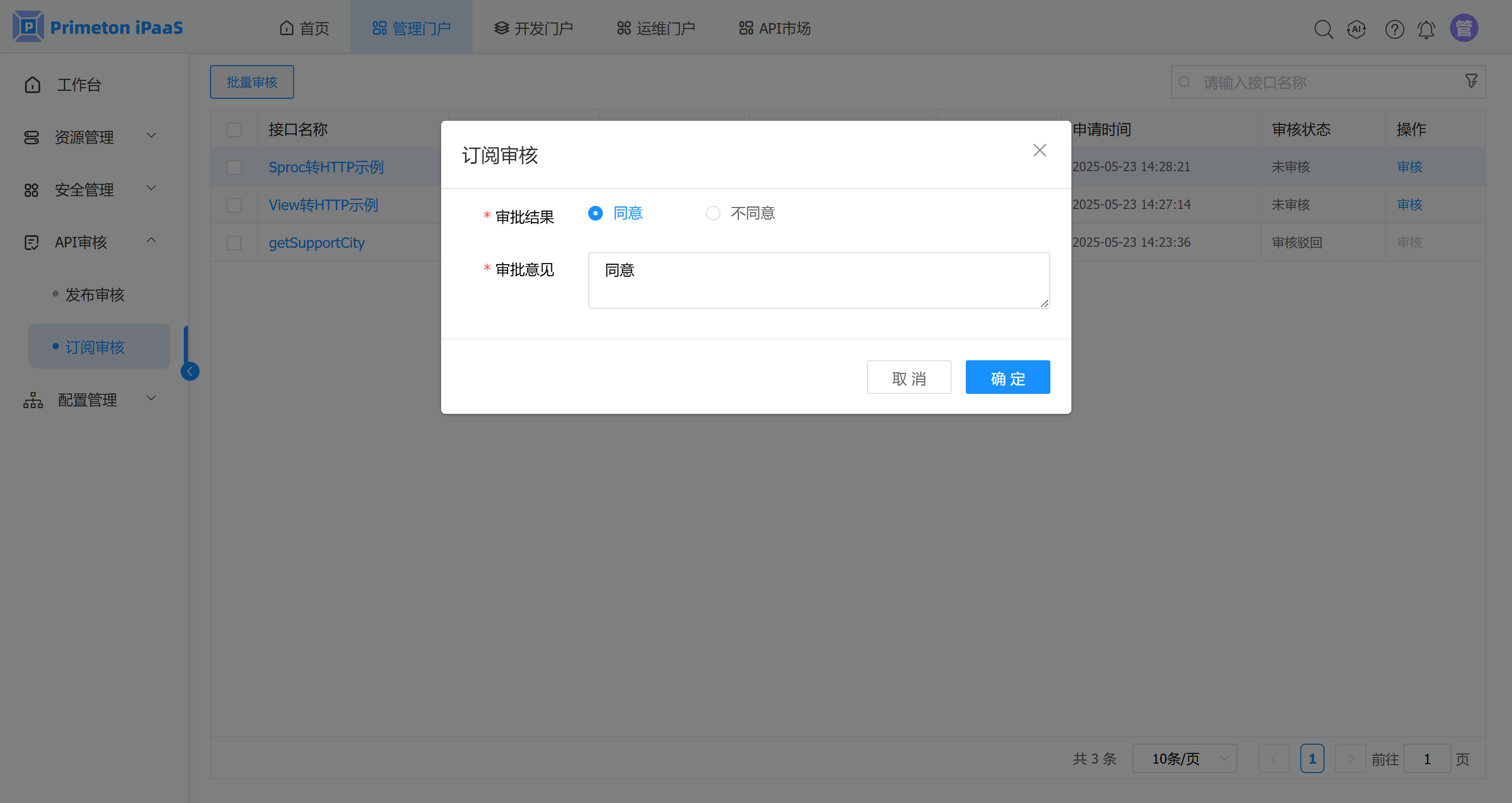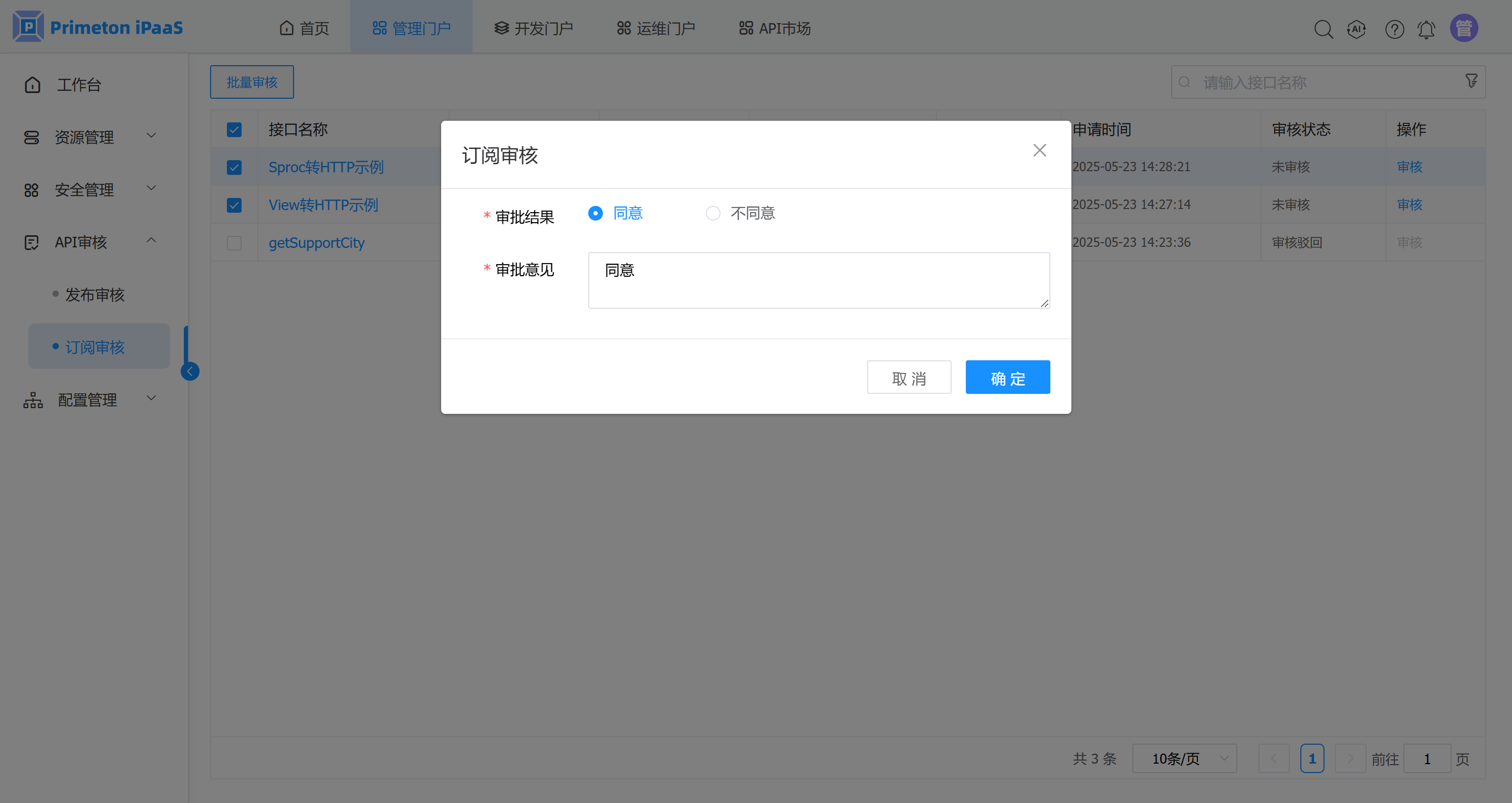 需要 管理门户 > 配置管理 > 全局配置 > 审核配置下的订阅审核被勾选,才能进行订阅审核。