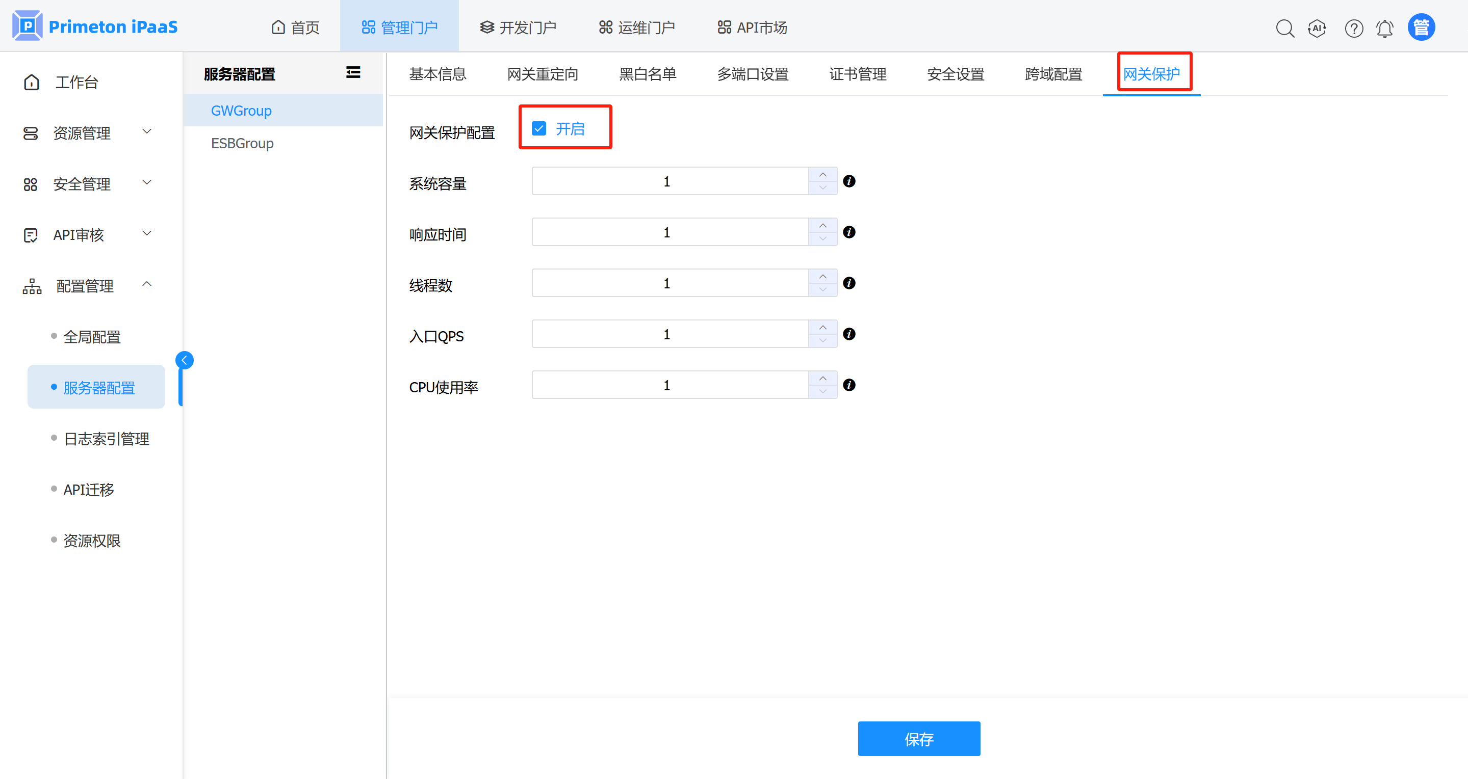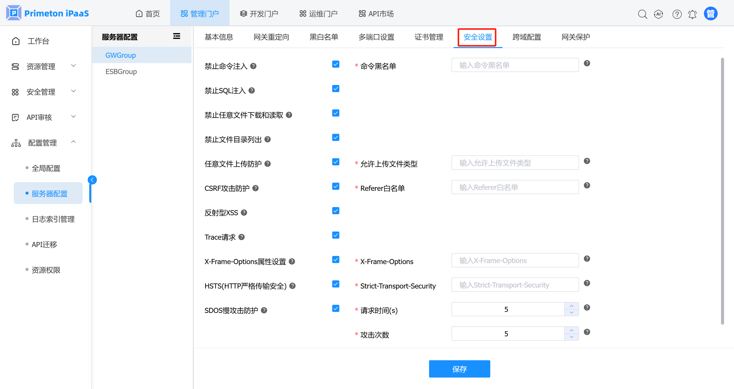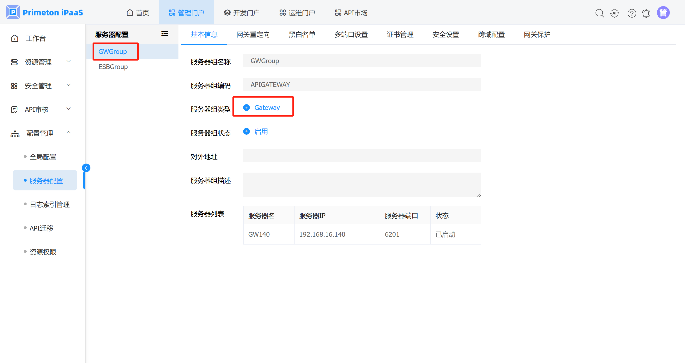 管理人员登录系统,进入管理门户,点击菜单“配置管理”>“服务器配置”,选择类型为“Gateway”的服务器组,页面展示当前服务器组“基本信息”、“网关重定向”、“黑白名单”、“多端口设置”、“证书管理”、“安全设置”、“跨域配置”、“网关保护”等方面信息。