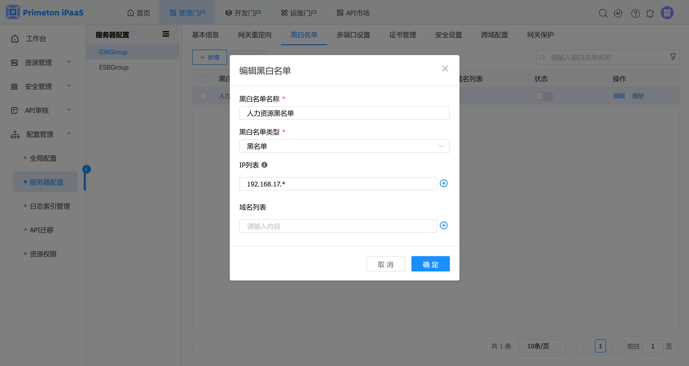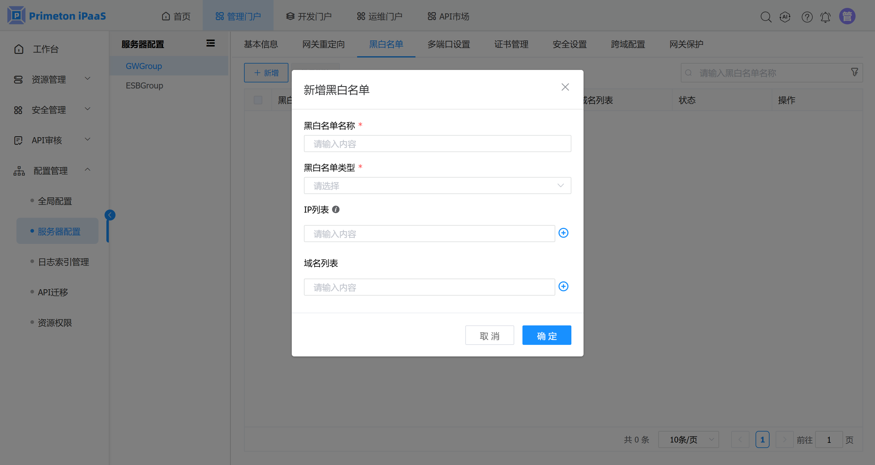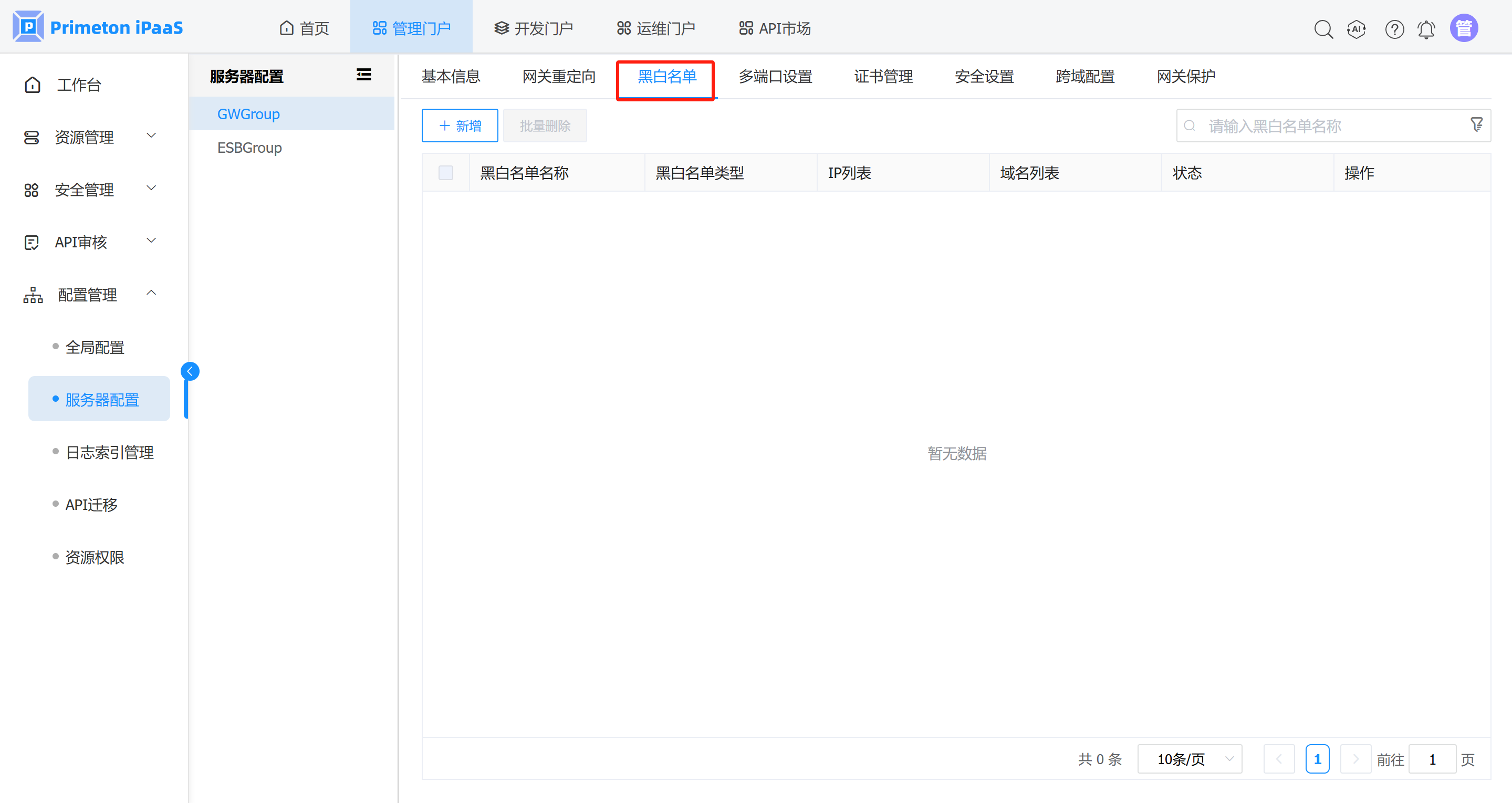 “服务器配置”页面,选择类型为“Gateway”的服务器组,进入“黑白名单”页签,进入黑白名单管理页面。