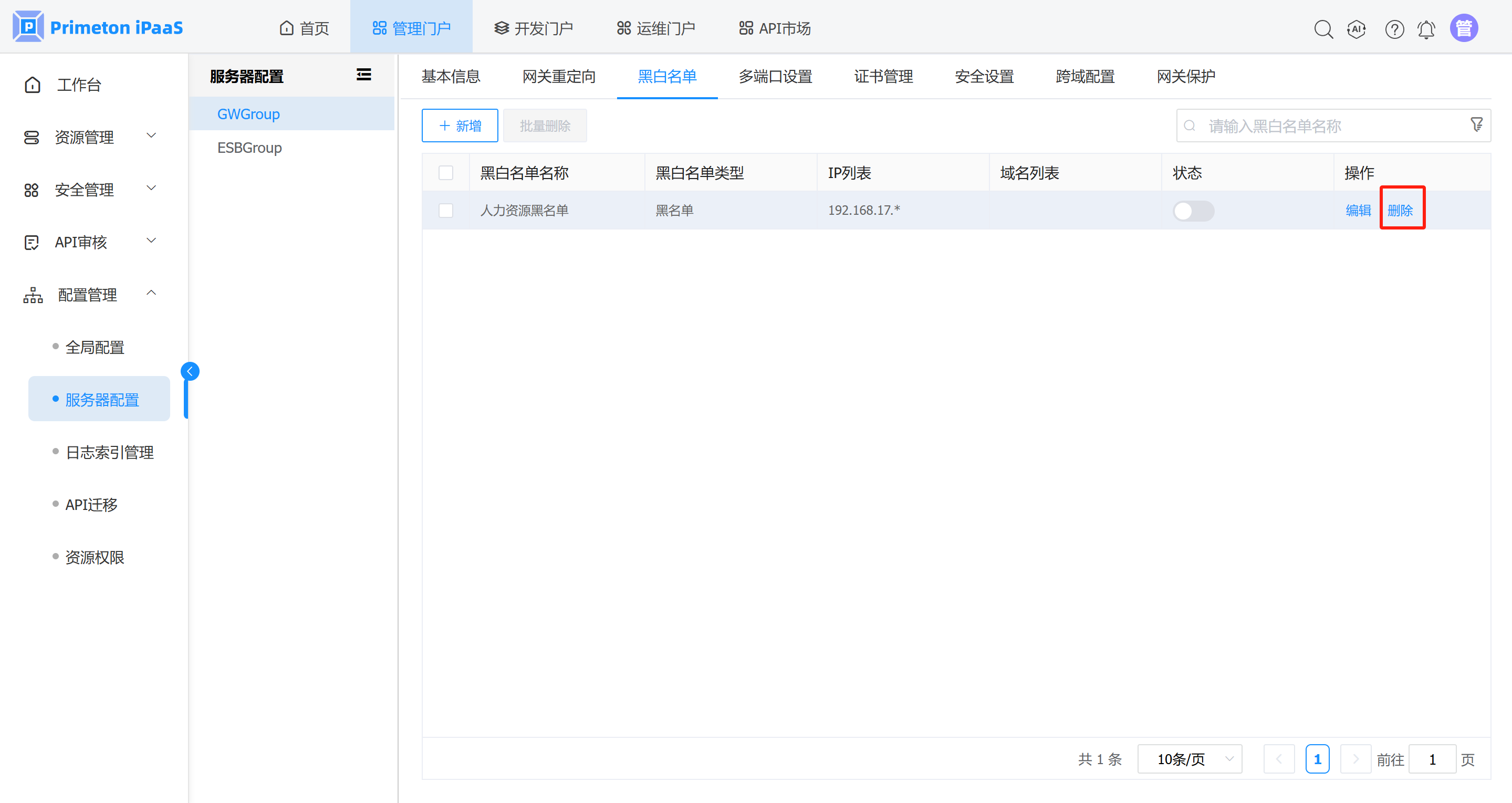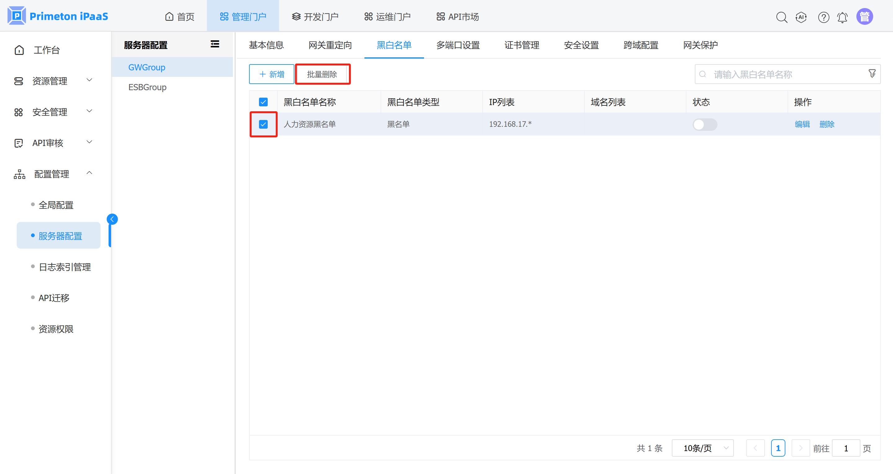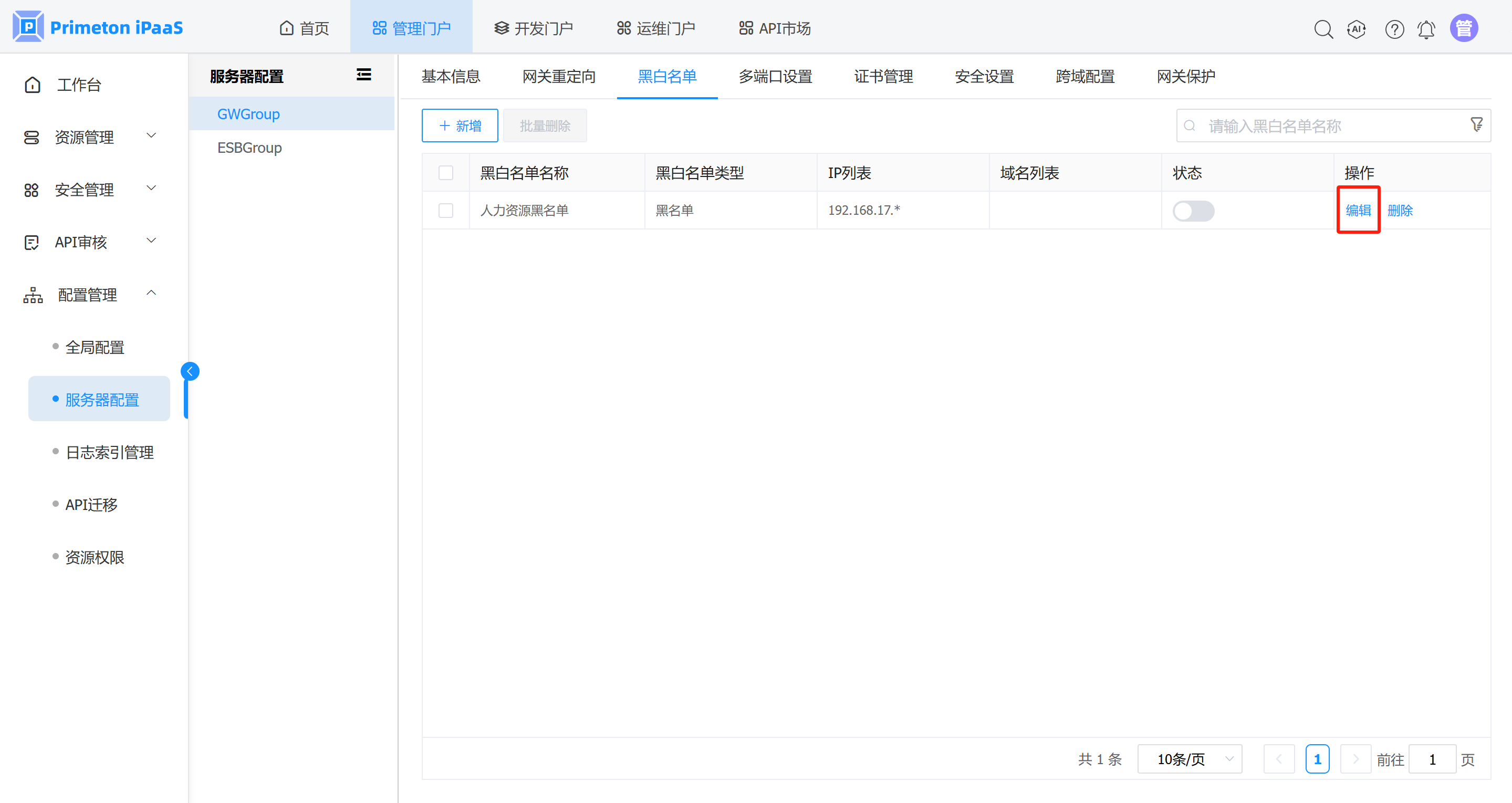 “服务器配置”页面,选择类型为“Gateway”的服务器组,进入“黑白名单”页签,进入黑白名单管理页面。