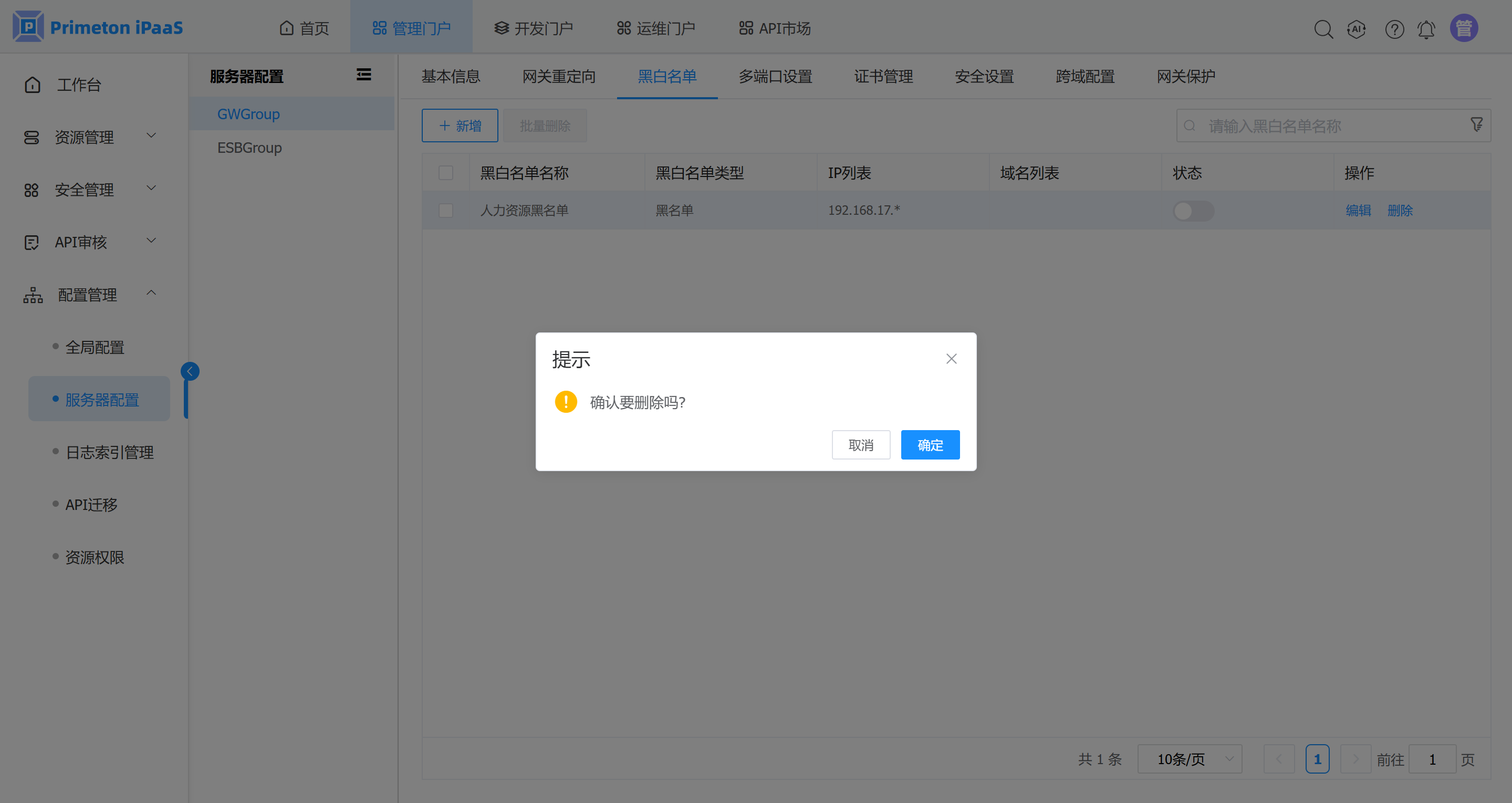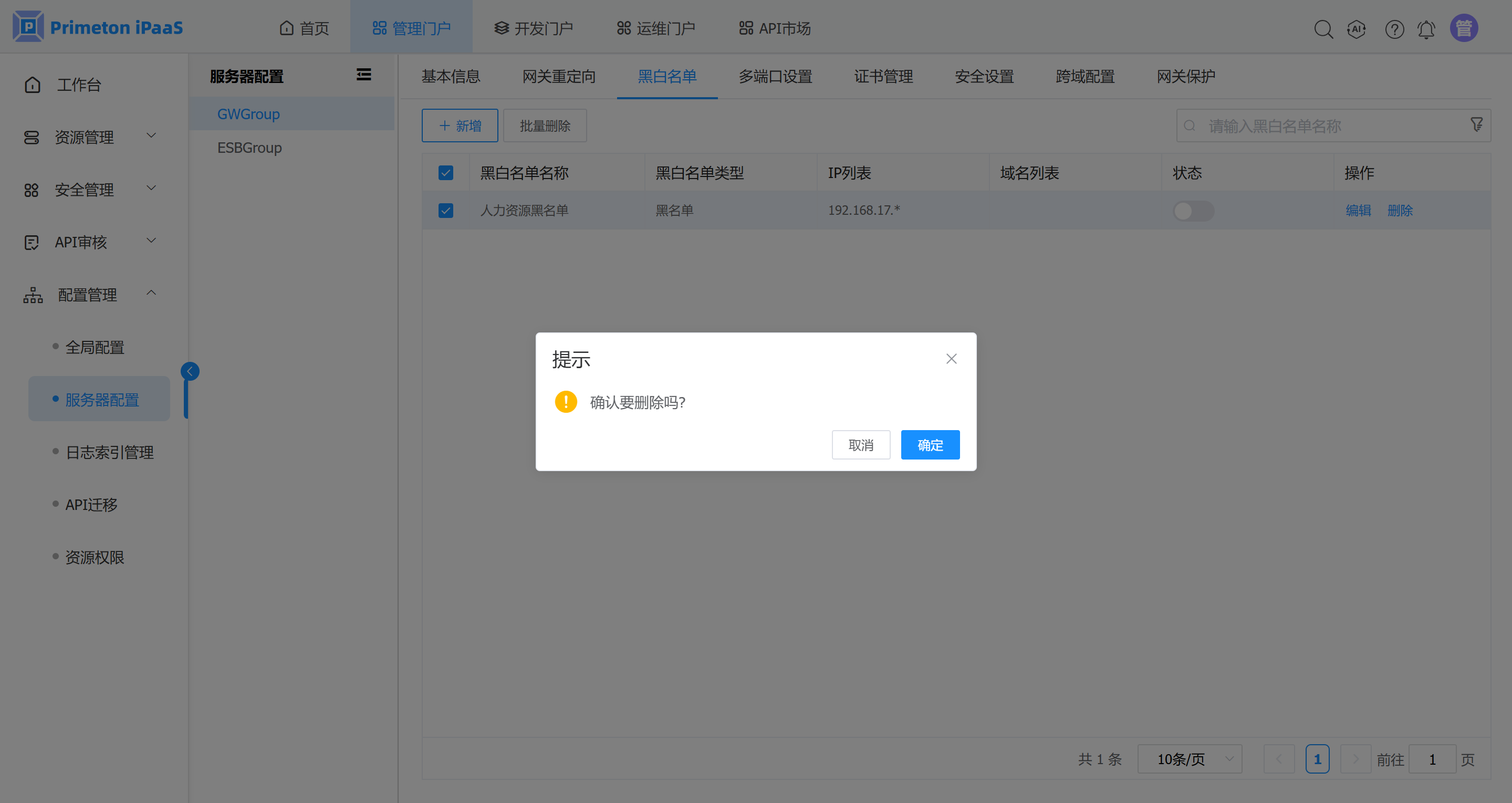 在“黑白名单”页签,选择一条黑白名单记录,点击操作列”删除“按钮,弹出删除确认页面。
