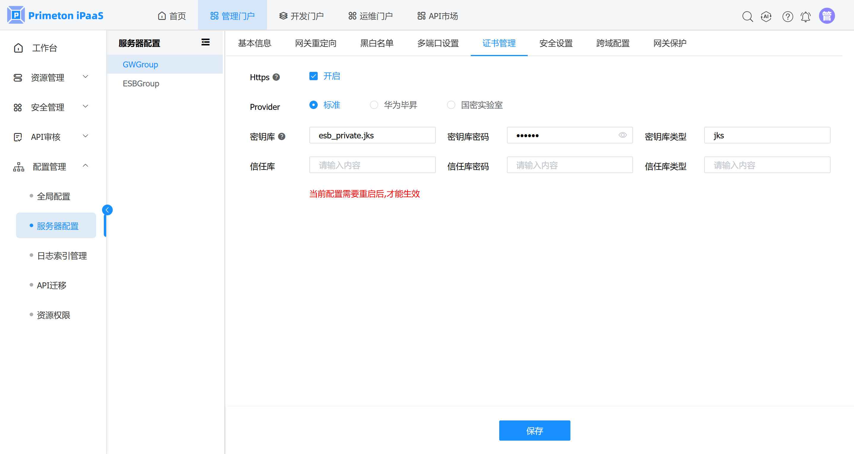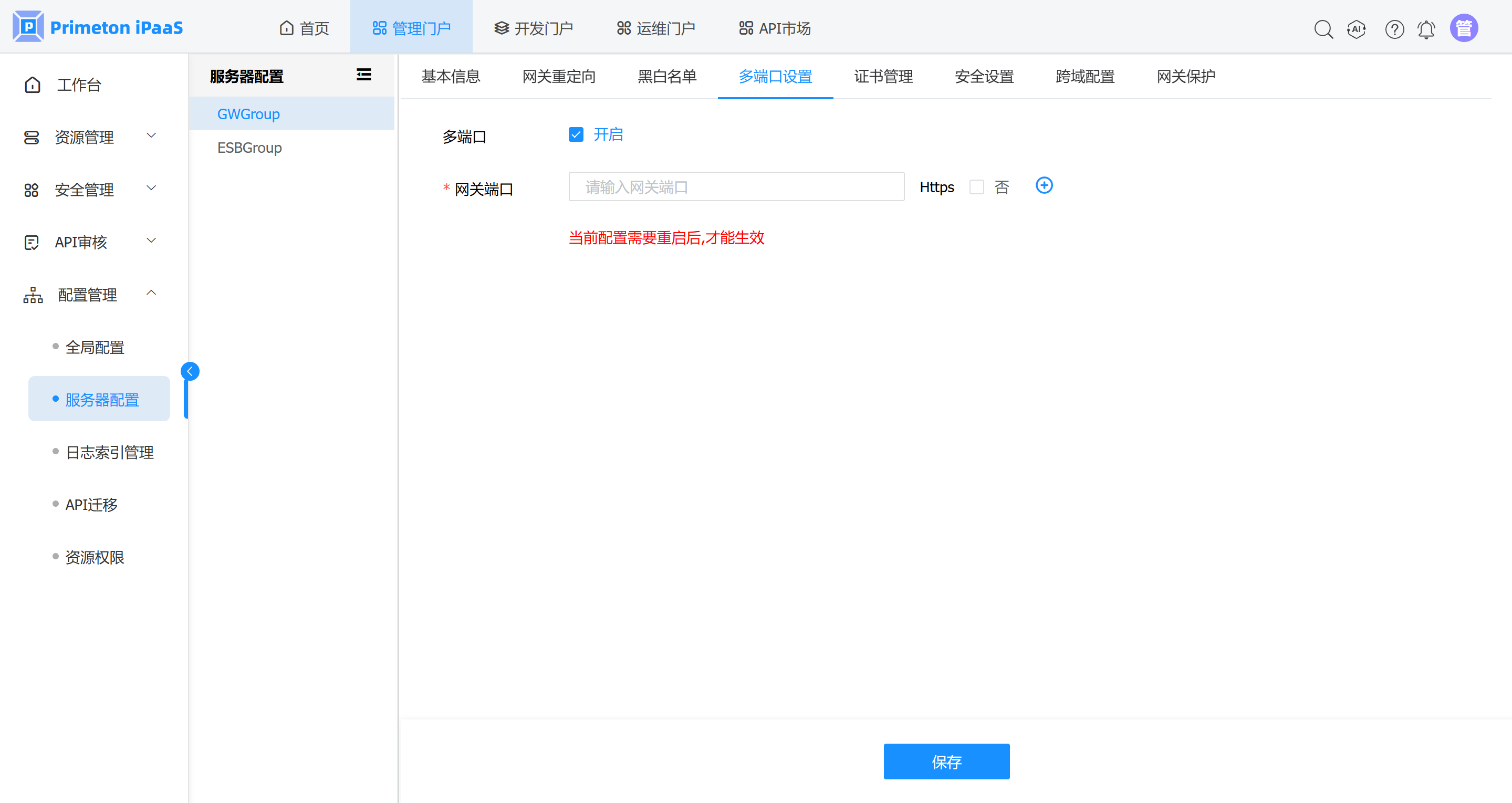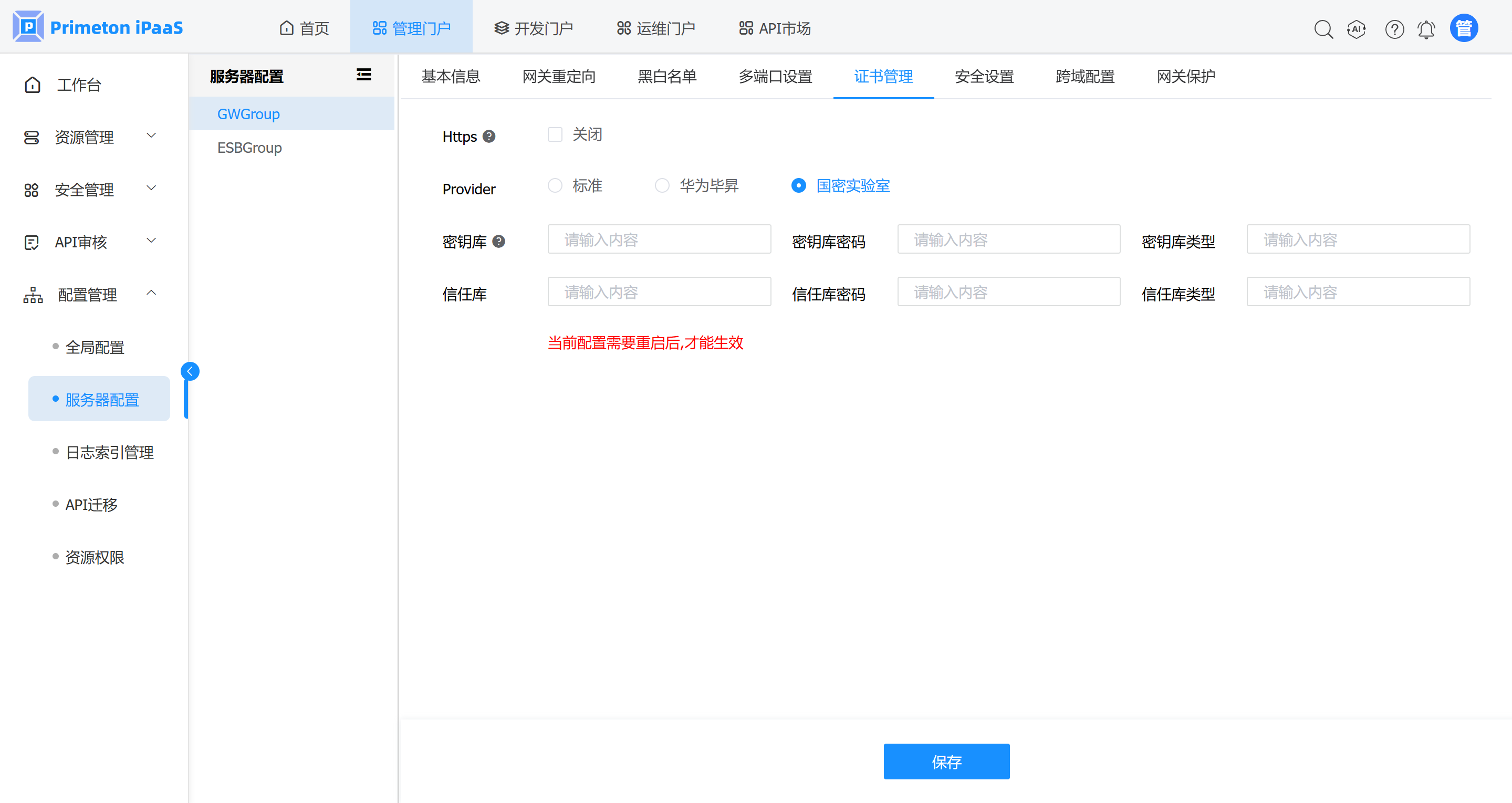 添加需要开通的端口点击保存(不可与网关配置文件端口号冲突),重启之后可通过网关添加的端口进行请求转发,勾选https首先需要配置https证书,详情请见本章节内 证书管理 。