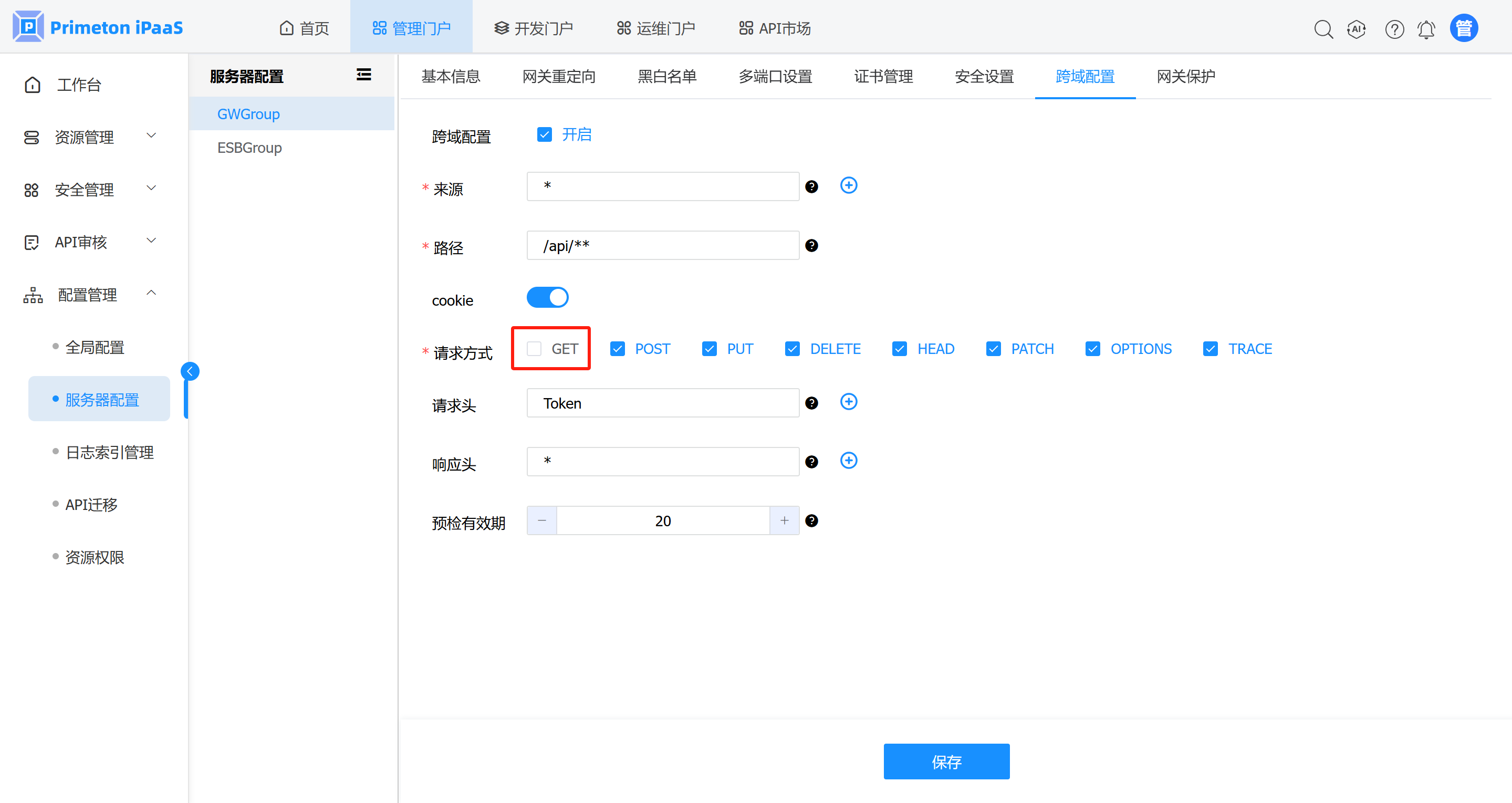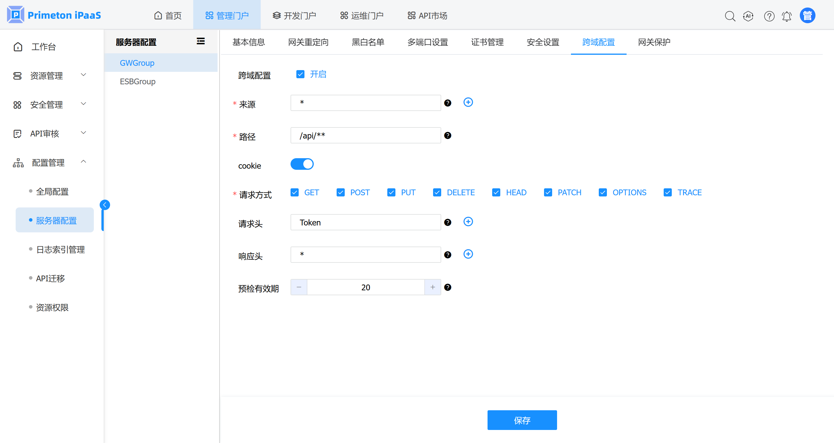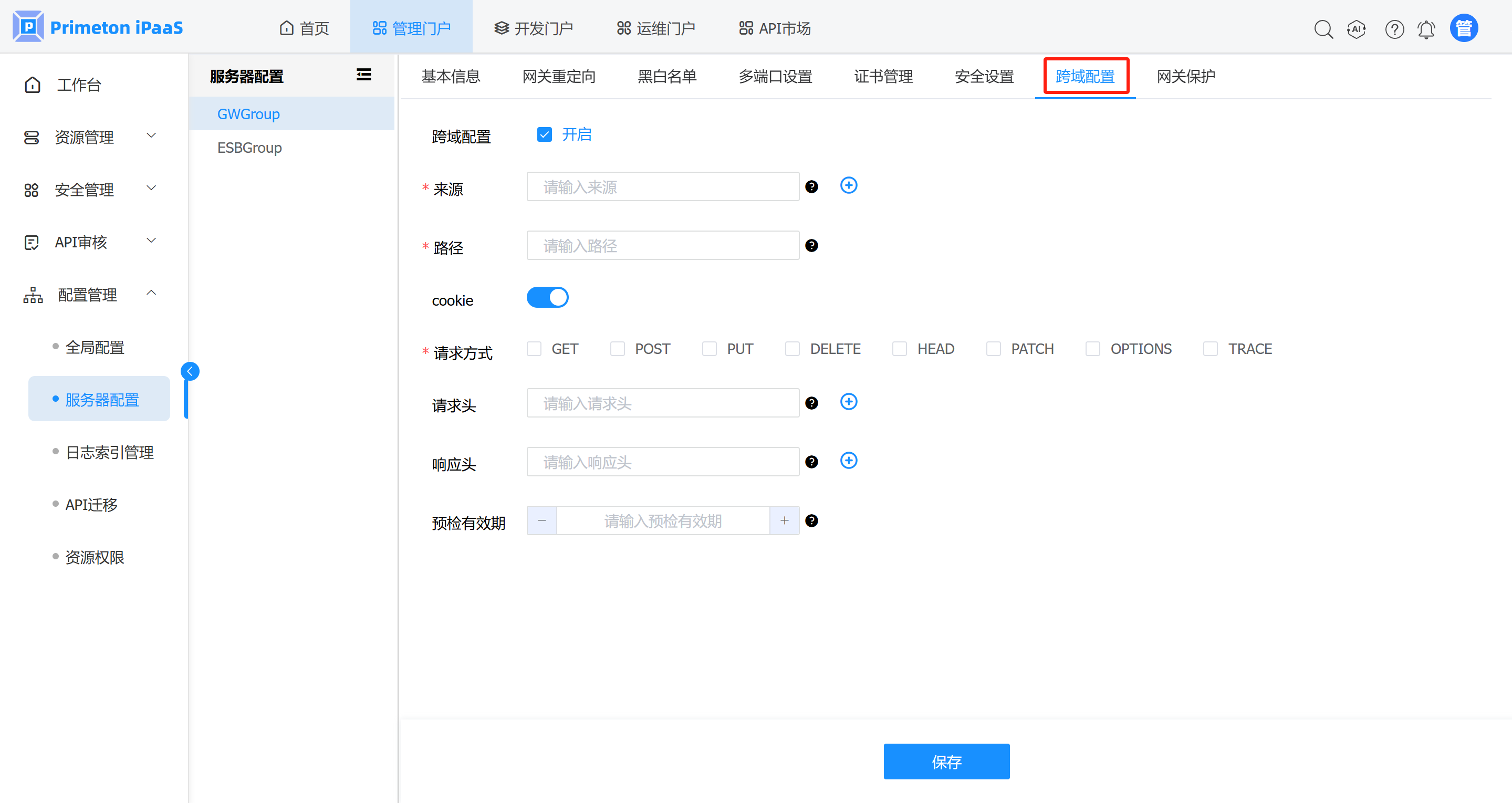 “服务器配置”页面,选择类型为“Gateway”的服务器组,进入“跨域配置”页签,进入跨域配置管理页面。
