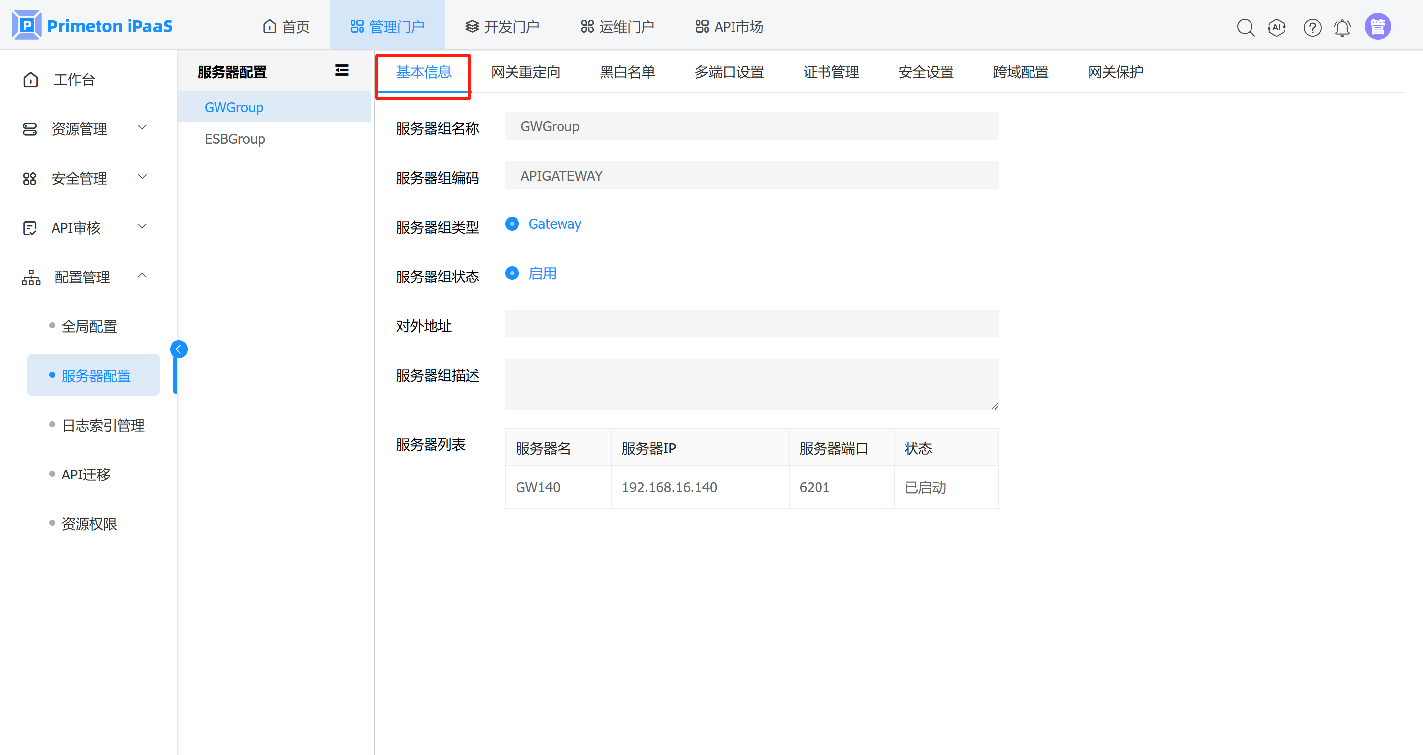 “服务器配置”页面,选择类型为“Gateway”的服务器组,进入“基本信息”页签,显示该服务器组的基本信息。