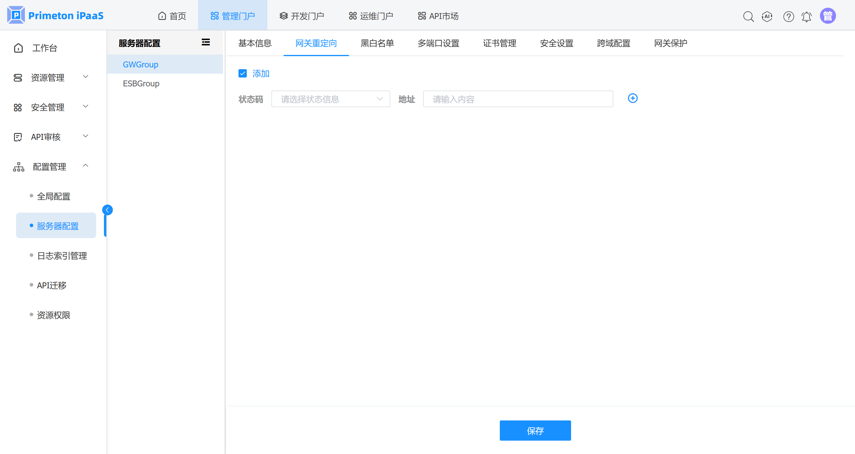 配置网关重定向:勾选“添加”,选择状态码,并配置要跳转的路径,点击保存。