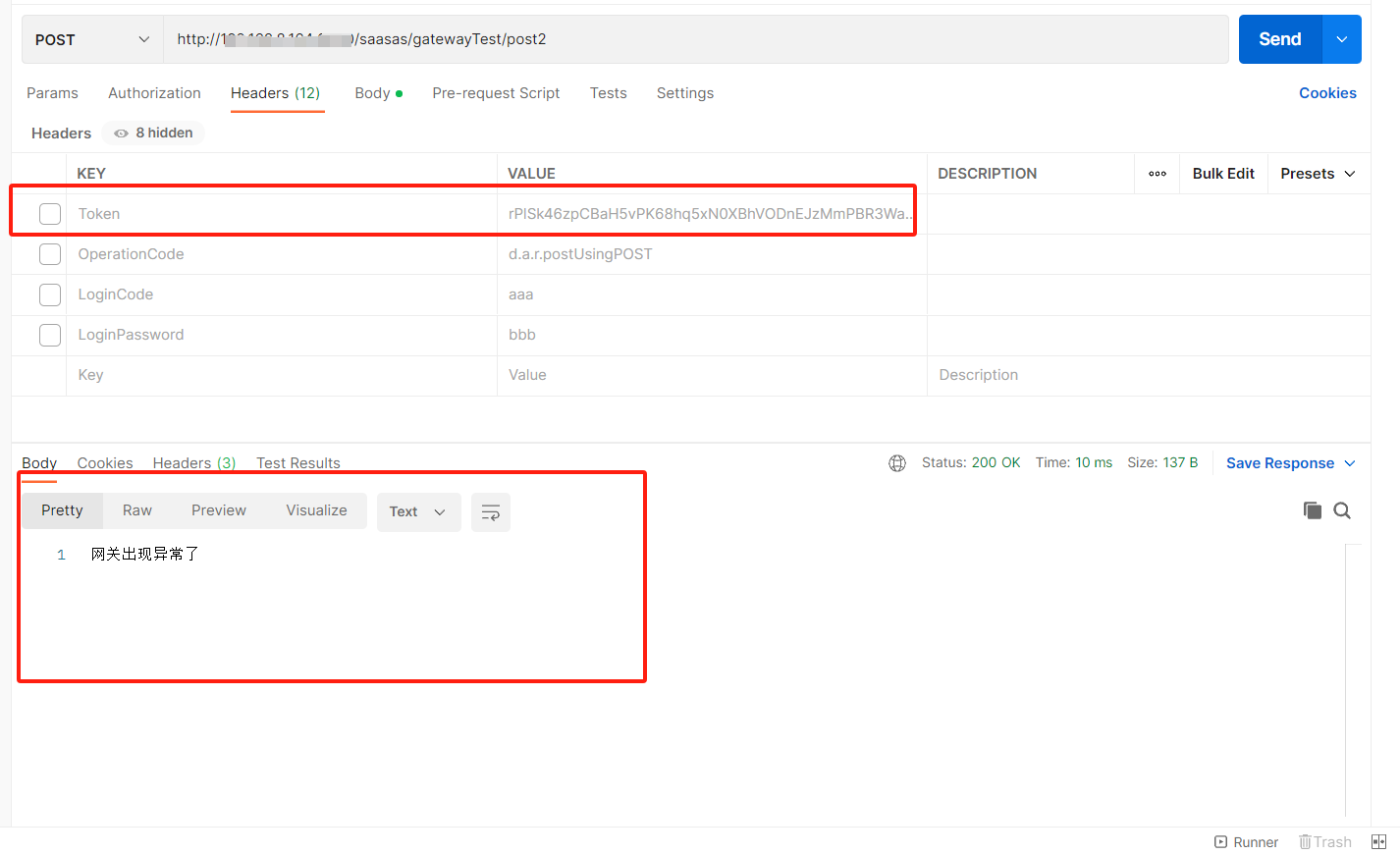 此处选择Token校验失败状态,重定向地址是一个测试接口,返回”网关出现异常了“提示