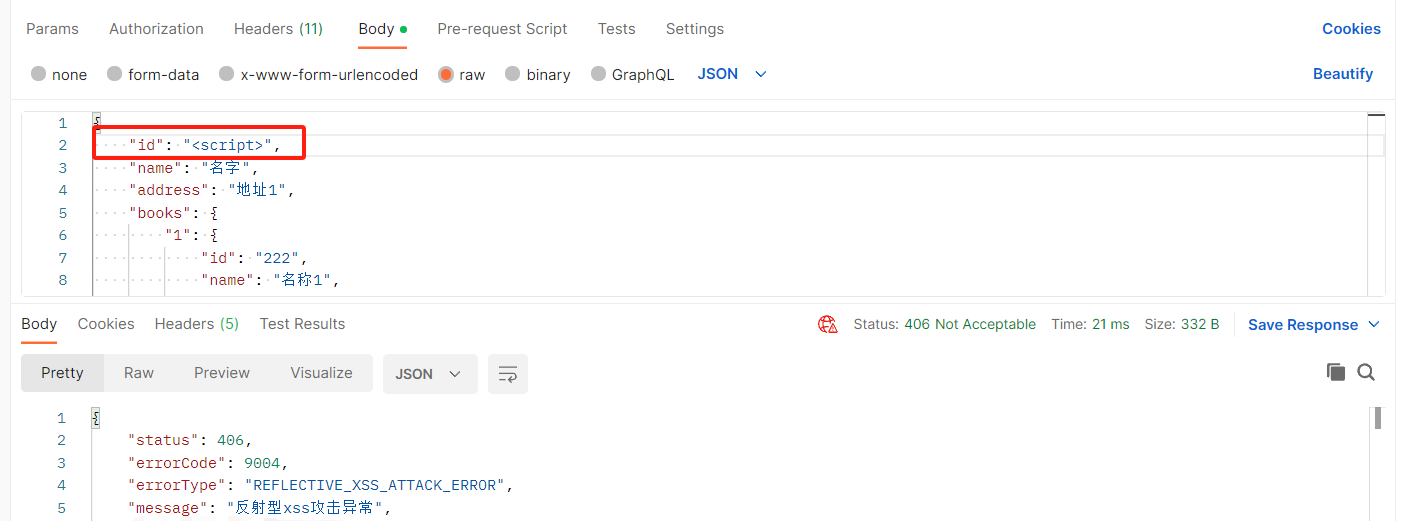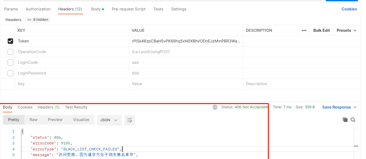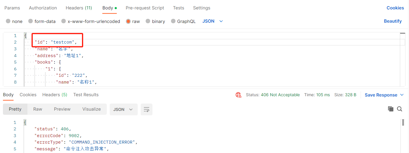 此处禁止的命令为"testcom",当请求参数或请求报文中包含相关命令,网关会拦截当前请求