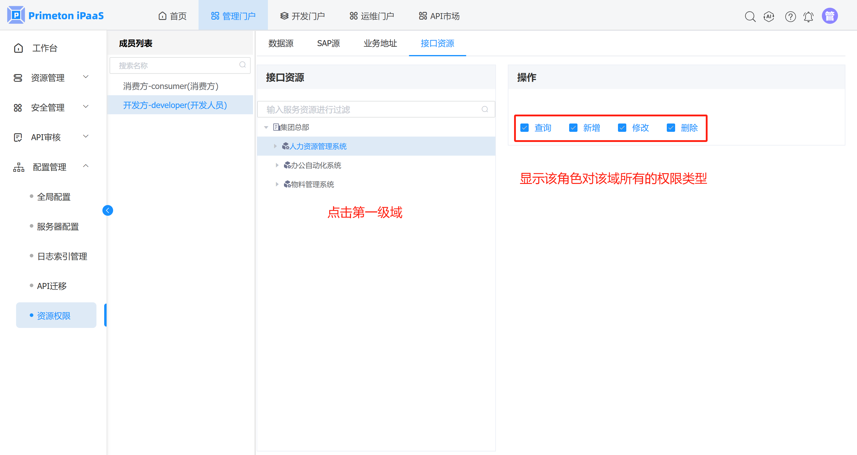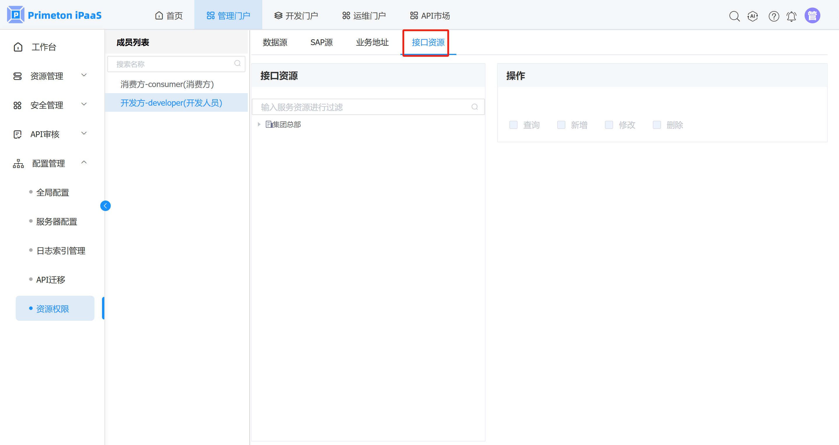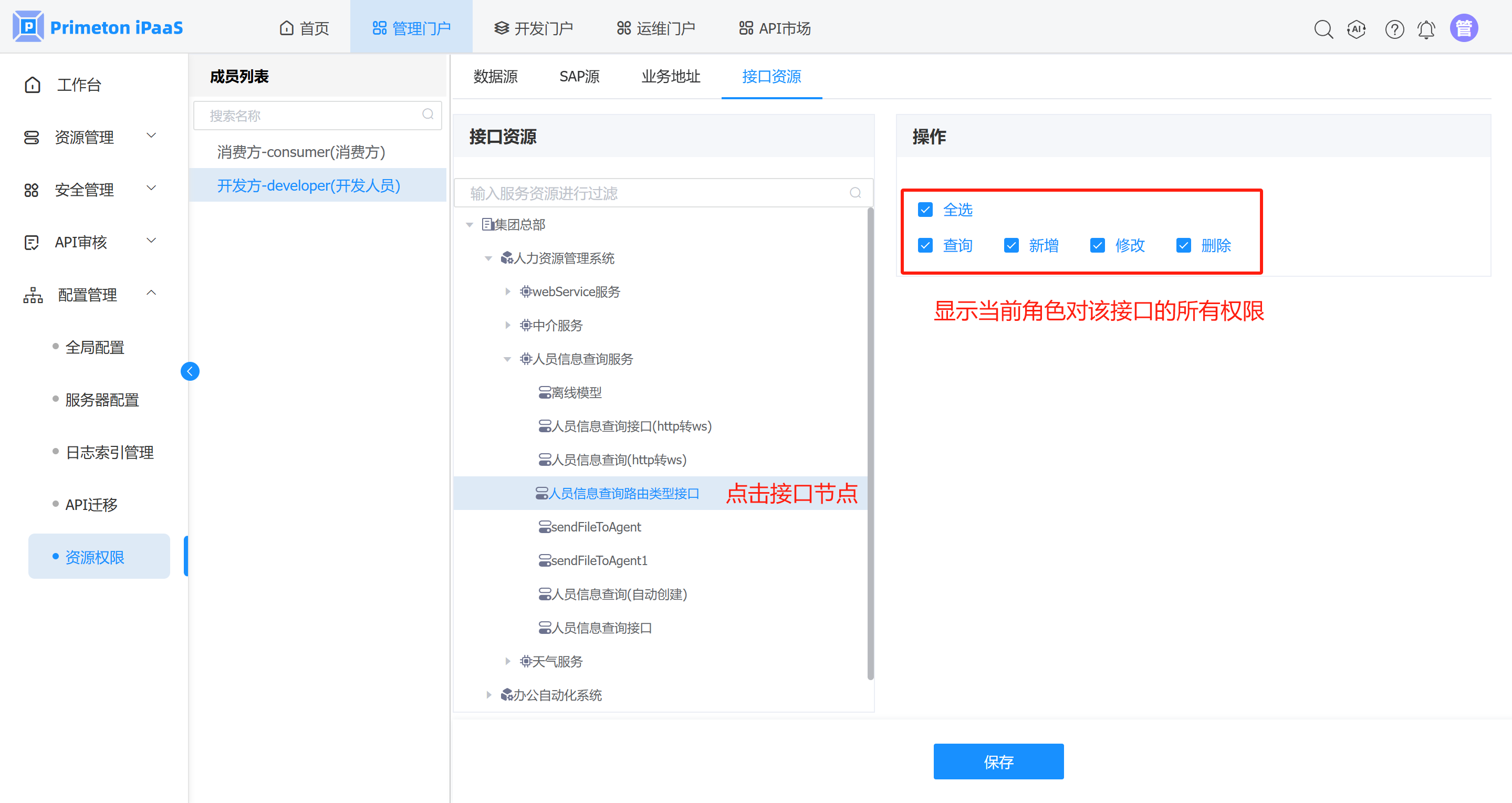 在“接口资源”页签,点击接口资源树中的节点,右侧操作框显示当前成员对所选节点拥有的权限。