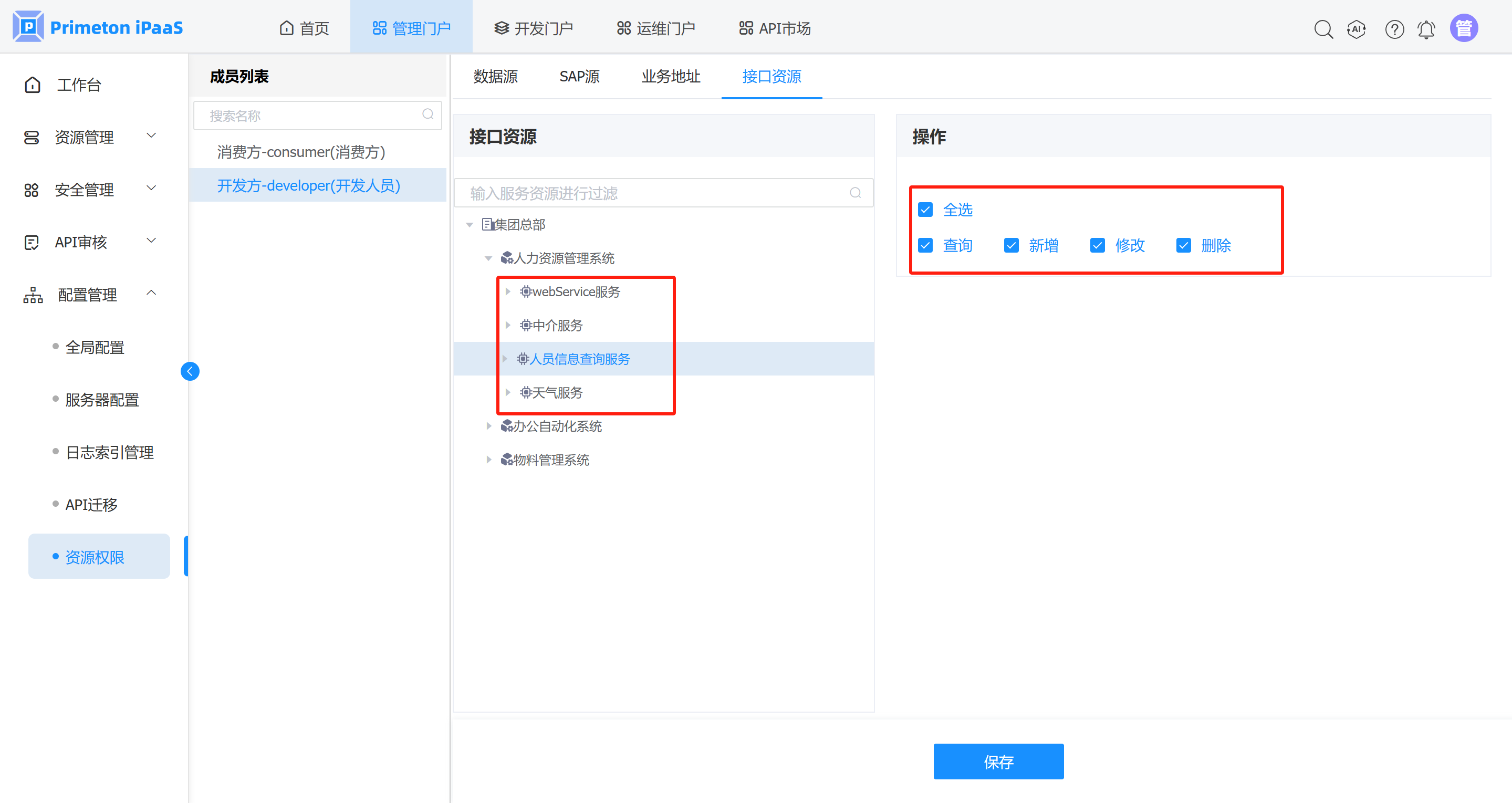 管理人员登录系统,进入管理门户,点击菜单“配置管理”>”资源授权“,进入资源授权界面,左侧展示成员列表,右侧展示数据源、SAP源、接口资源等资源授权页签。