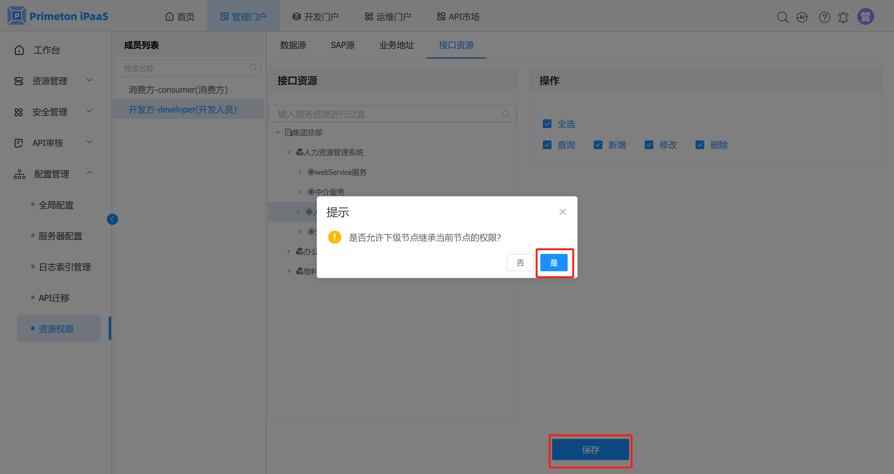 在“接口资源”页签,点击接口资源树的服务节点,在操作框勾选权限类型,然后点击保存按钮,弹出权限配置提示框。
