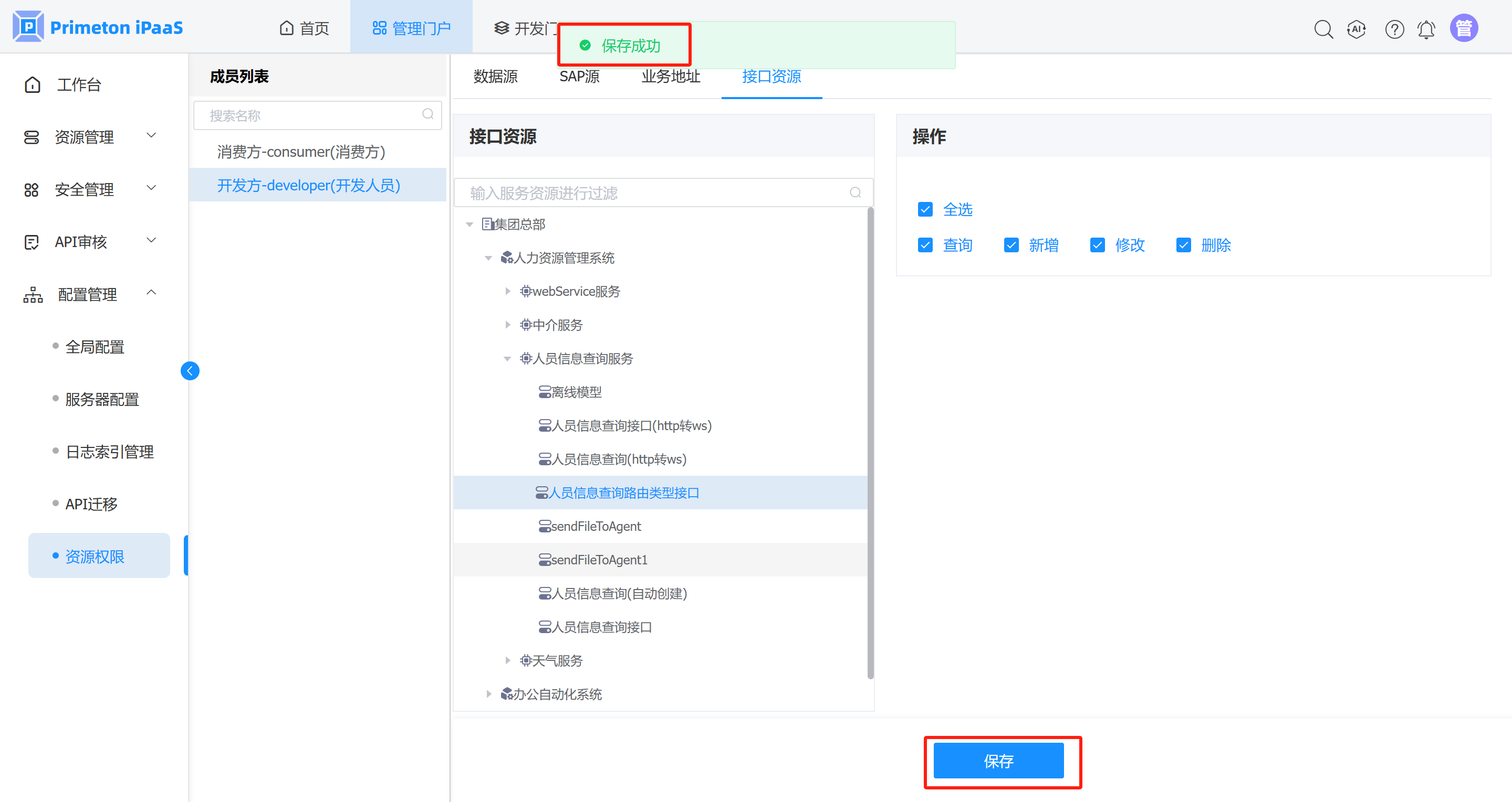 在“接口资源”页签,点击接口资源树的接口节点,在操作框勾选权限类型,然后点击保存按钮,弹出保存成功提示框。