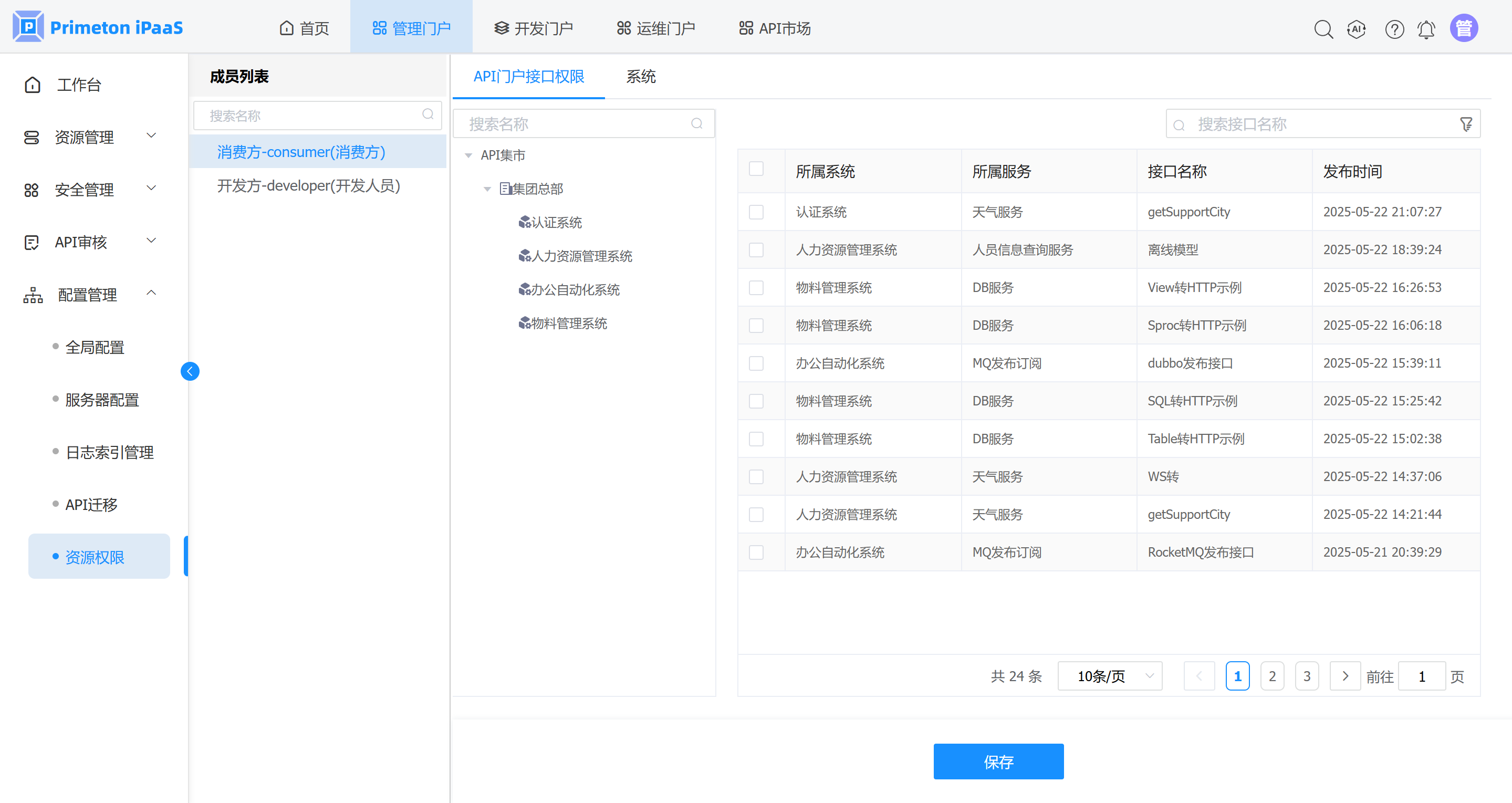 管理人员登录系统,点击“管理门户->配置管理->资源权限”进入资源权限页面,在左侧成员列表点击消费方成员,进入消费方API门户接口权限查询页面,可查看该成员已授权的系统和其对应的API接口权限记录。