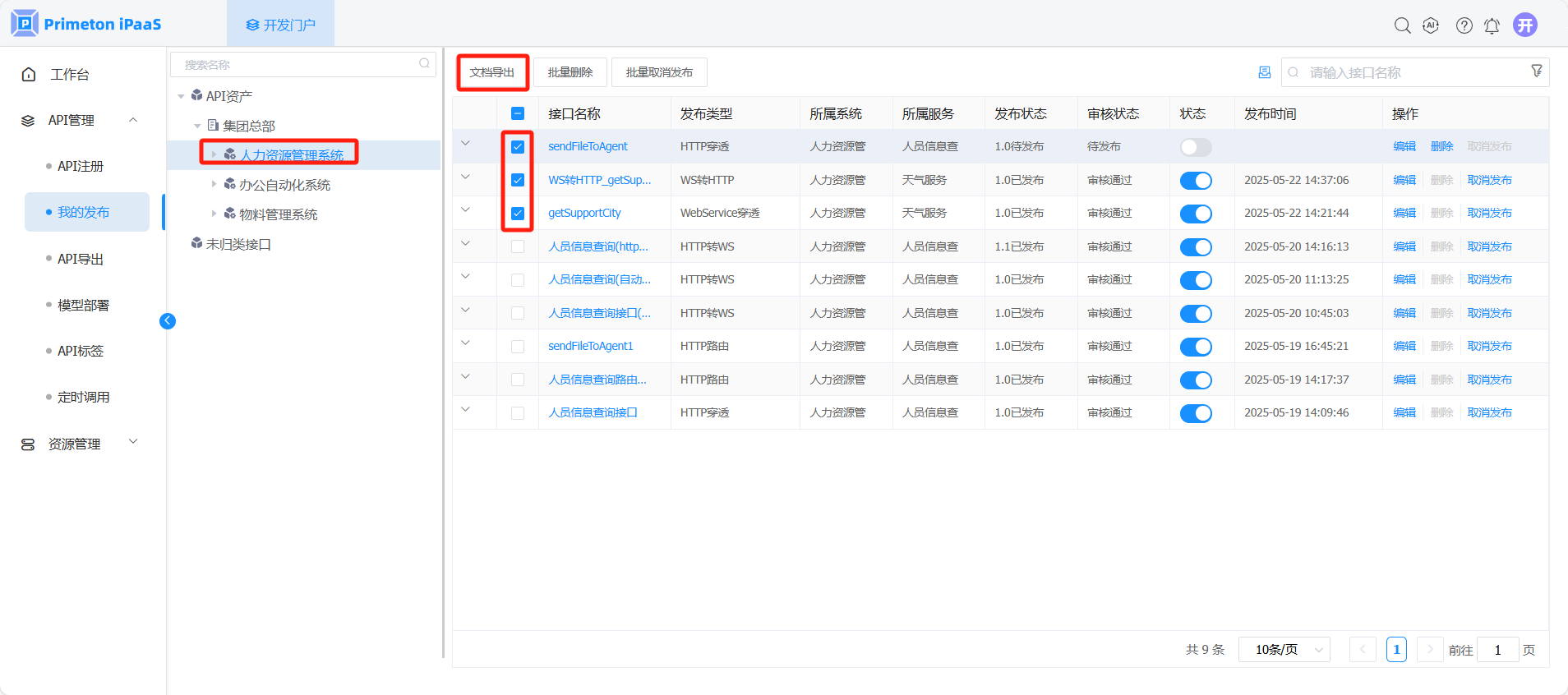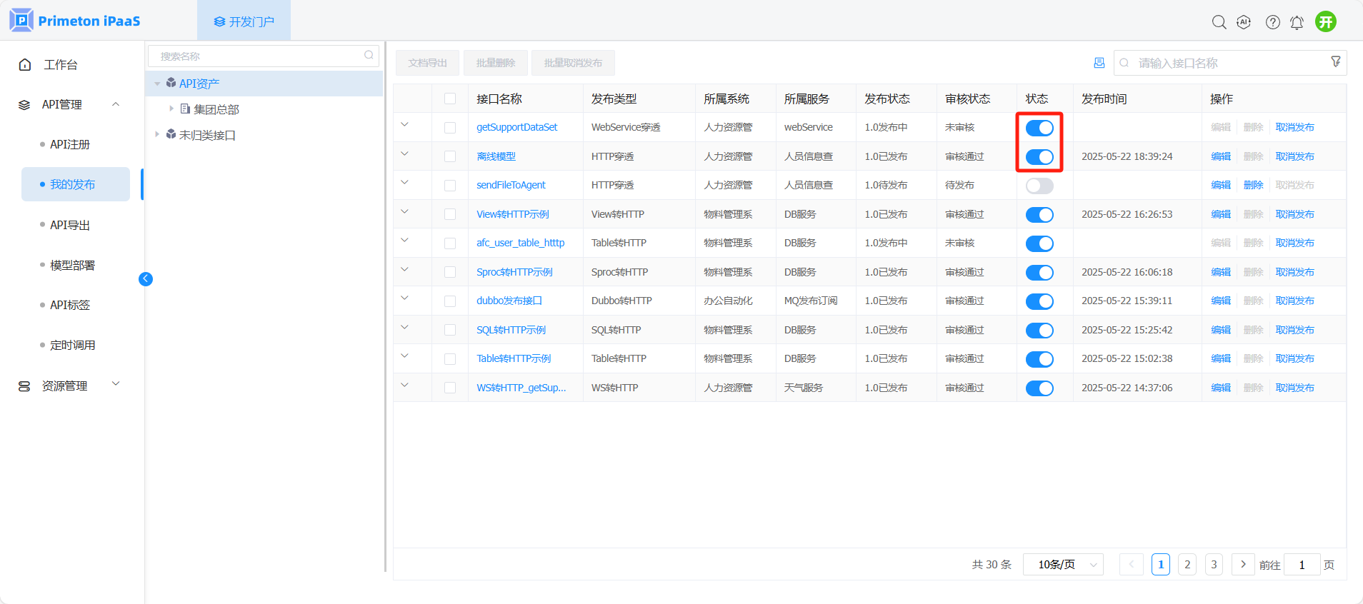 在“我的发布”界面,选择左侧组织树中API所属节点,选择需要上线的API发布记录,点击该记录状态列的开关按钮,上线接口。