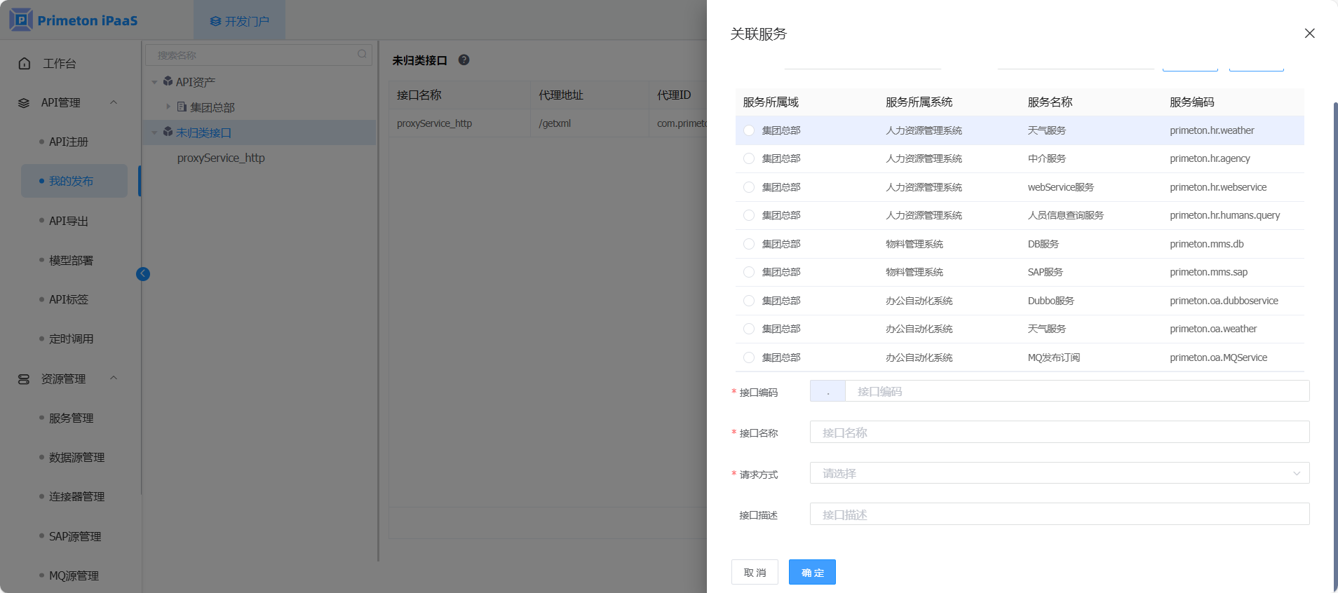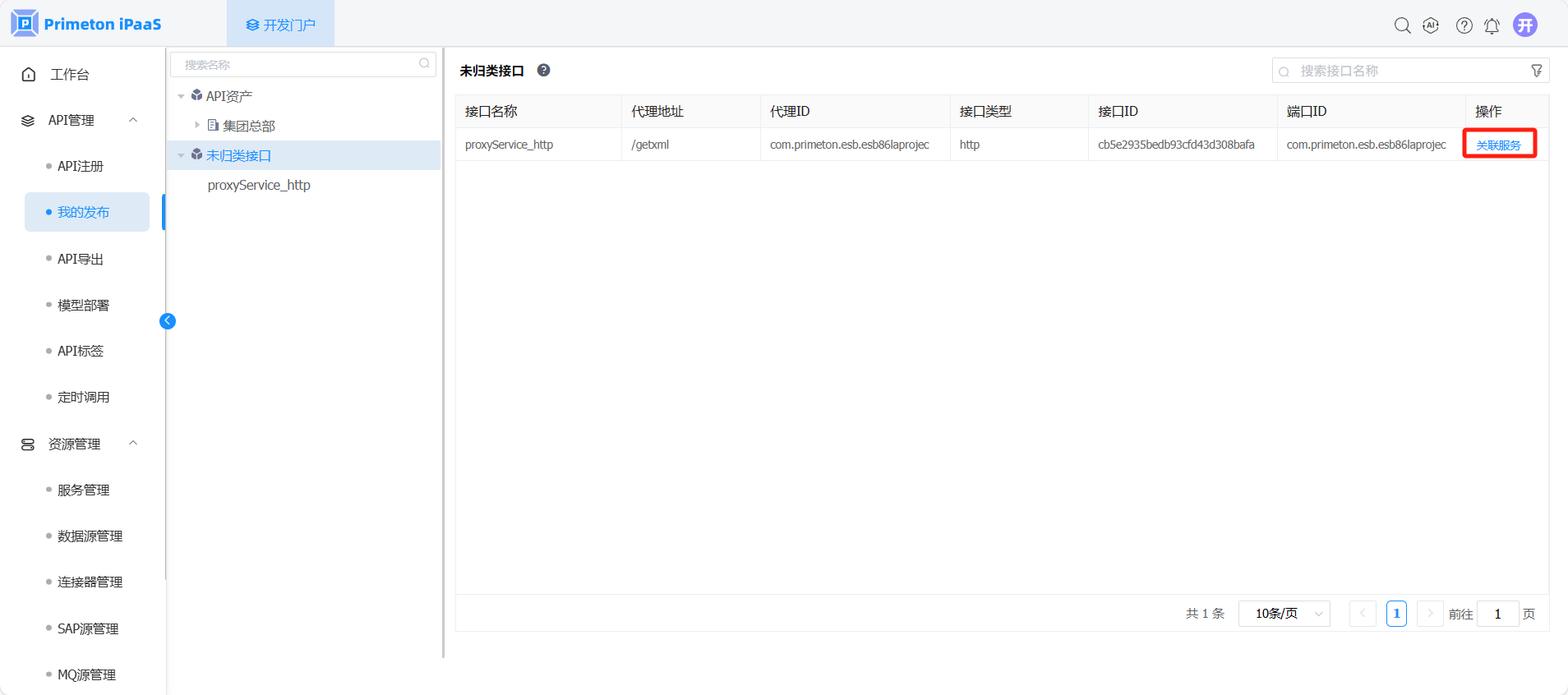 在“开发门户 > API管理 > 我的发布“页面,在未归类接口类别中,选择记录点击操作列“关联服务”按钮,打开关联服务界面。