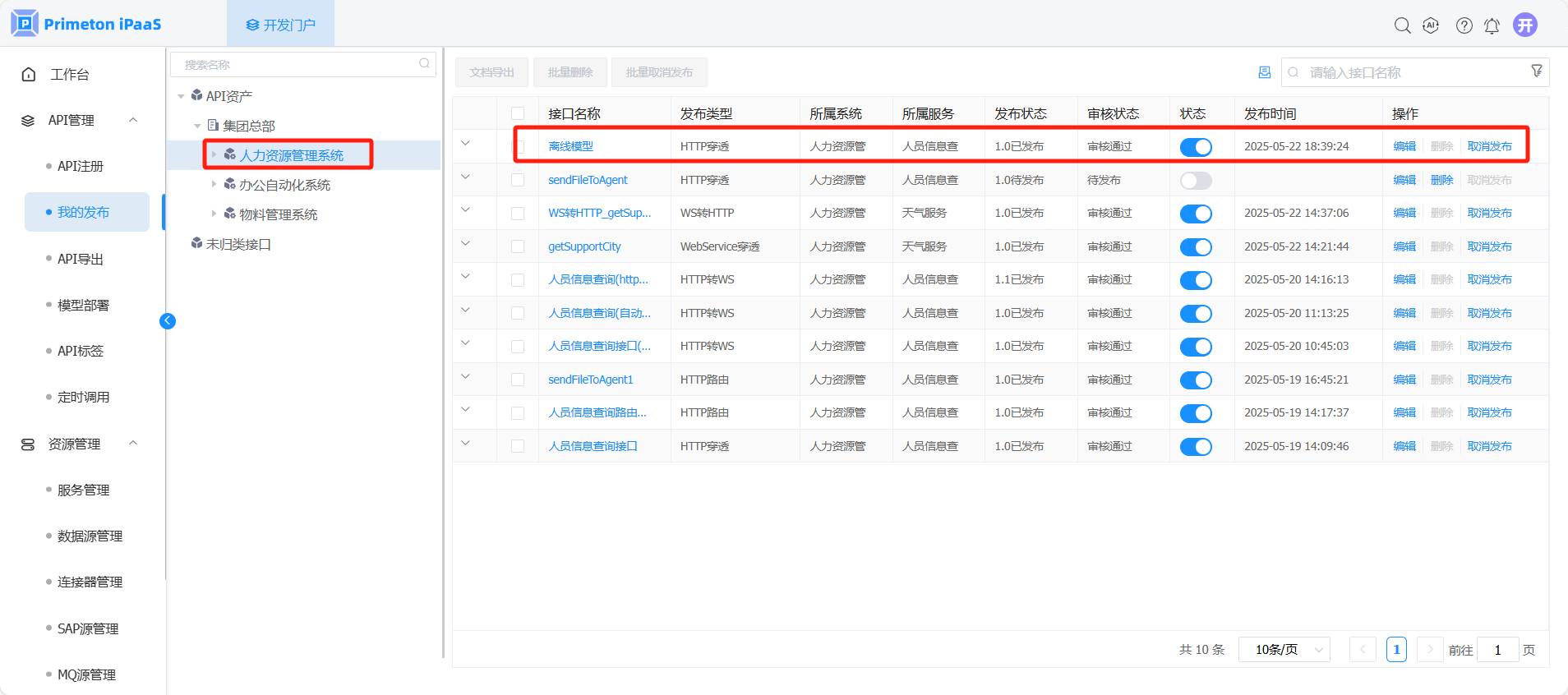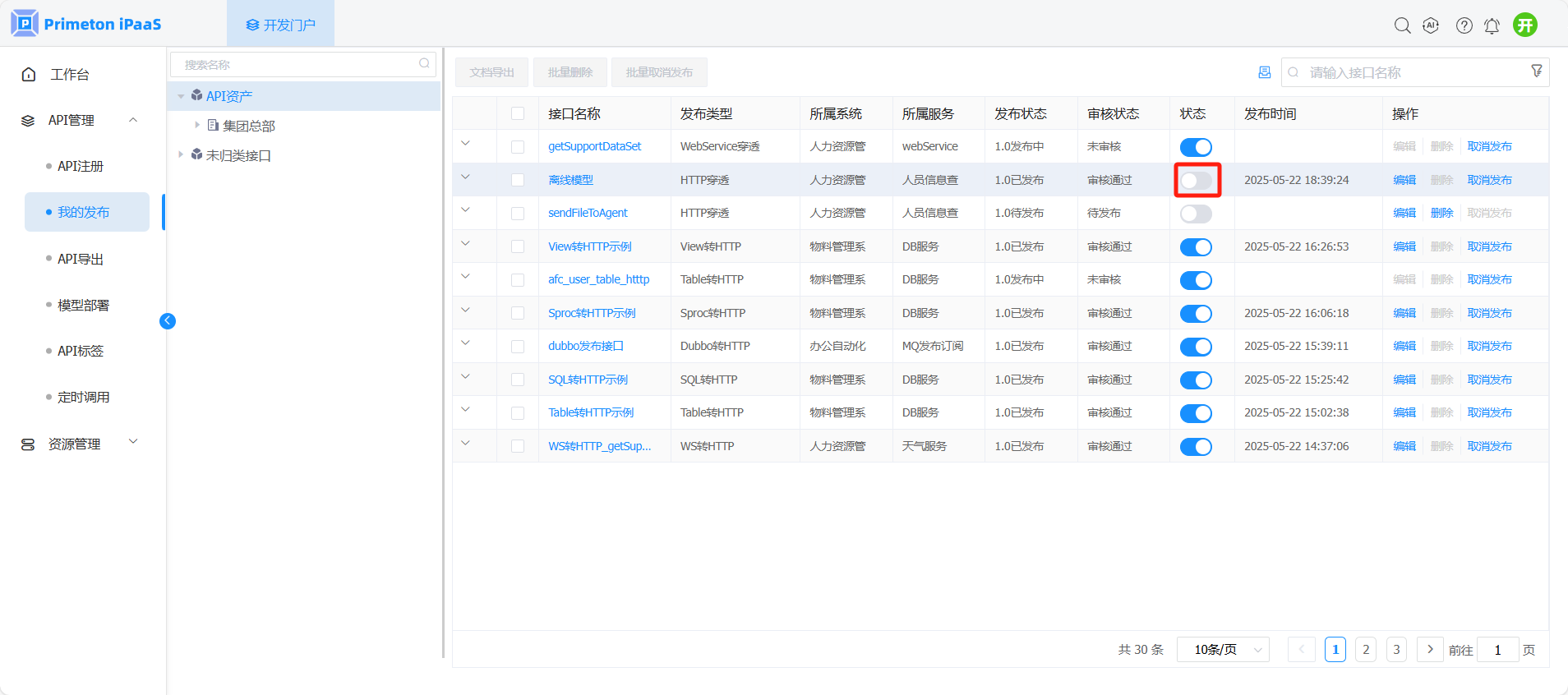 在“我的发布”界面,选择左侧组织树中API所属节点,选择需要下线的API发布记录,点击该记录状态列的开关按钮,下线接口。
