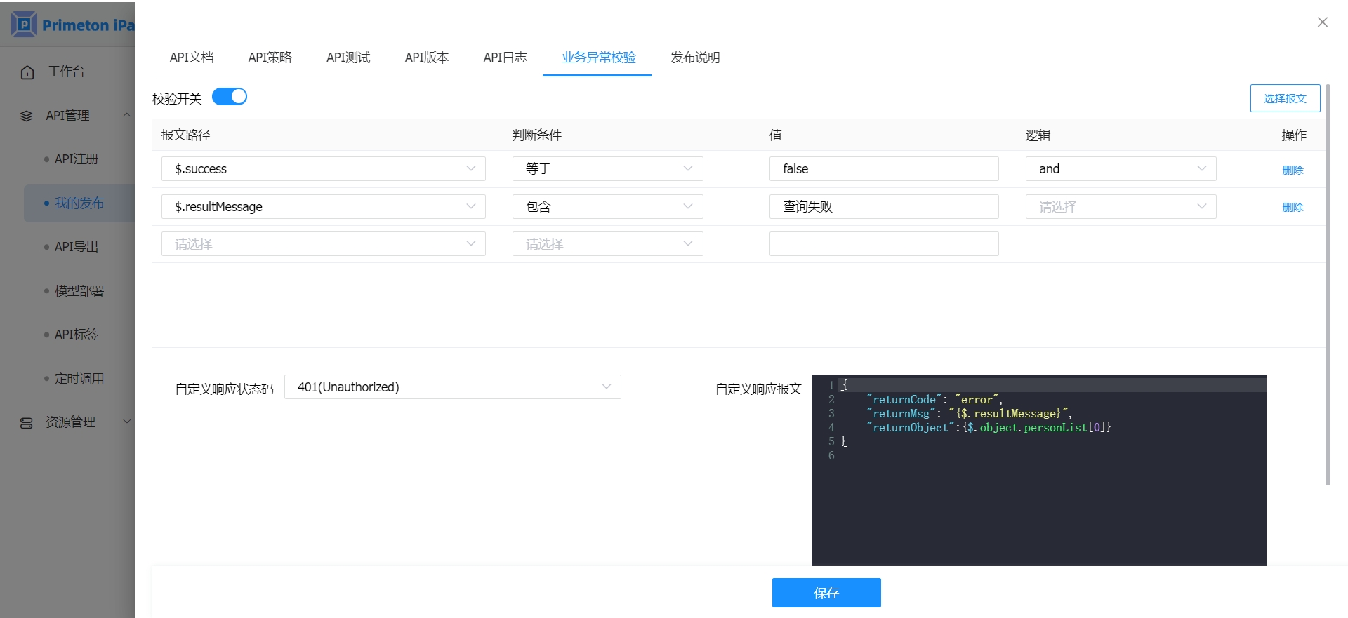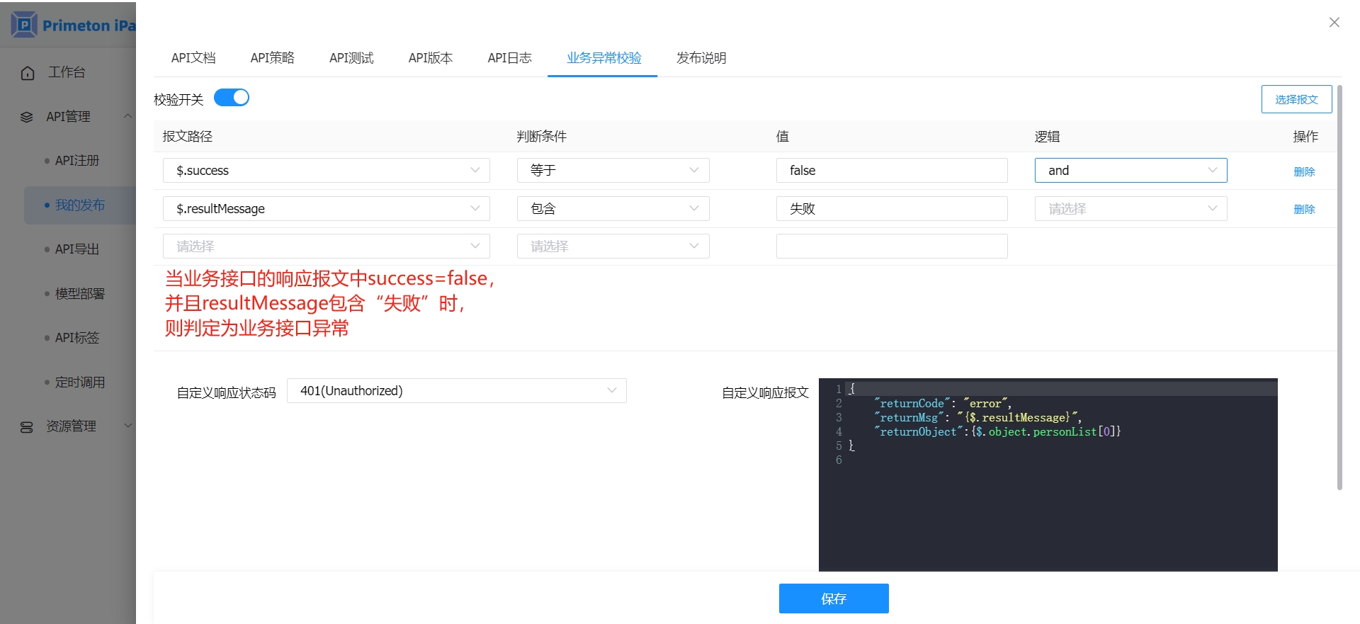 业务异常校验只针对正常响应的报文进行校验(支持对json报文和xml报文进行校验),如果接口开启业务异常校验功能,当业务接口响应状态码是4xx或5xx时,不进行业务异常校验(也不会返回自定义响应状态码和自定义响应报文)。只有业务接口响应状态码不是4xx或5xx时,才会进行业务异常校验。
