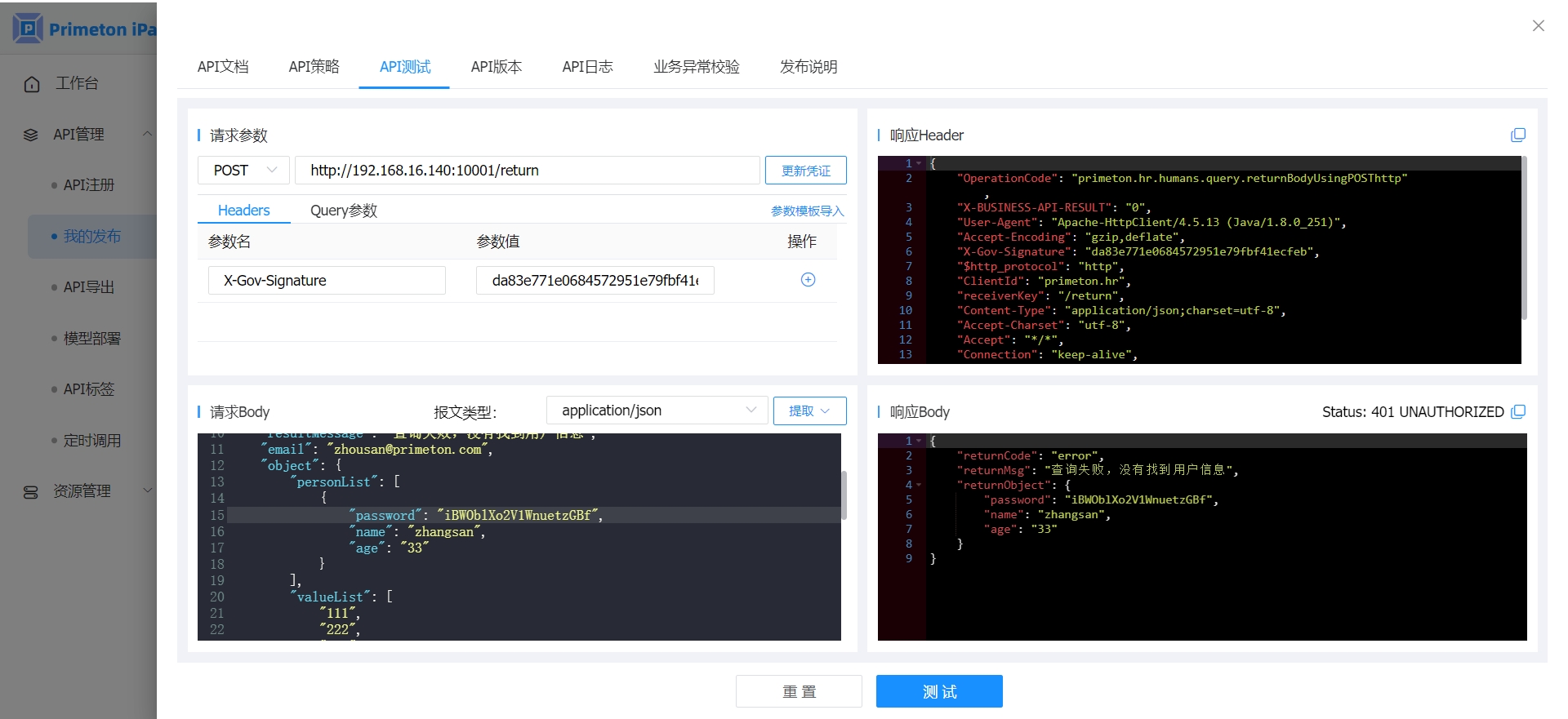 在“接口详情”页面,进入“API测试”页签,按业务接口的需求,填写访问配置项,点击“测试”按钮,进行接口测试。