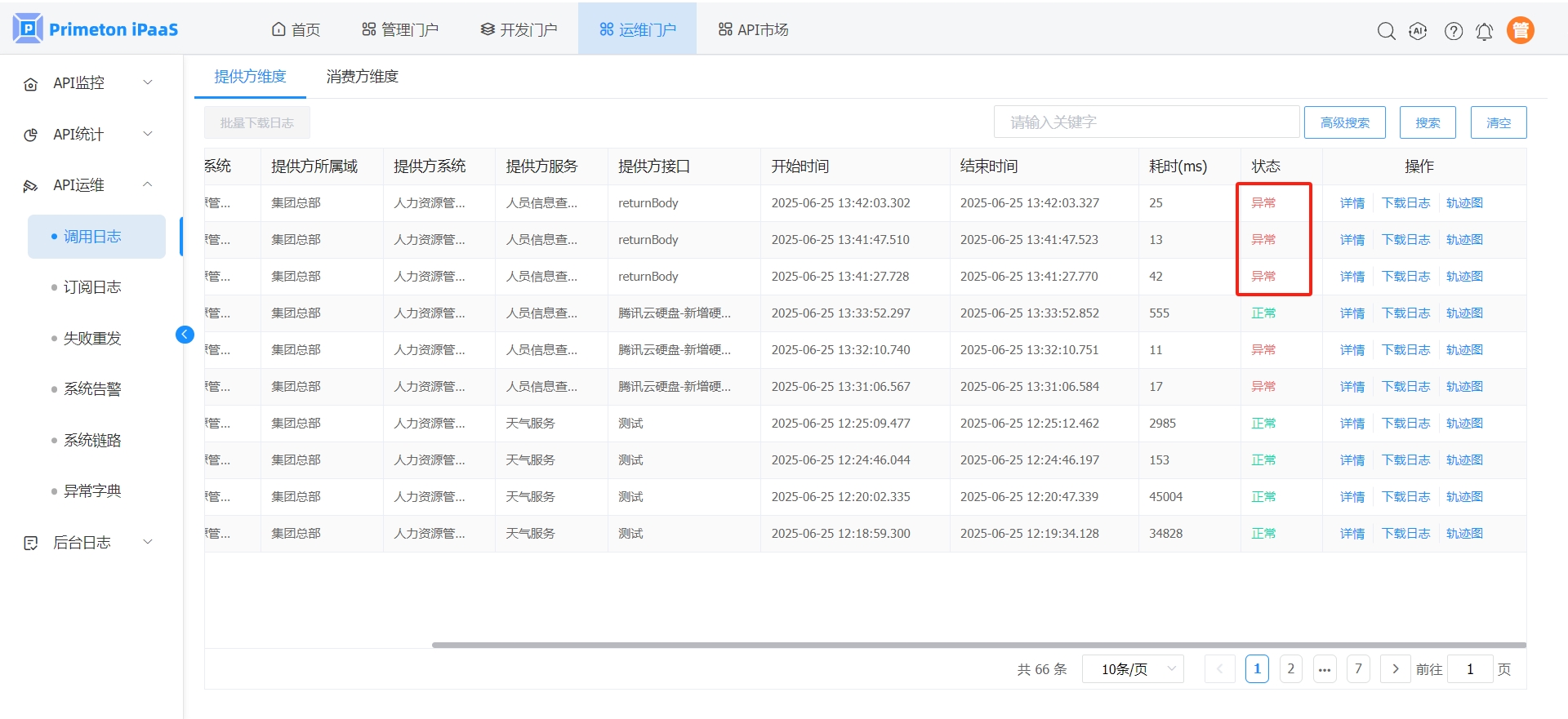 业务异常校验会根据用户配置的条件判断是否属于业务异常,当业务接口的响应报文符合判断条件时,认为是业务异常,调用日志记录的状态是“异常”,如下所示: