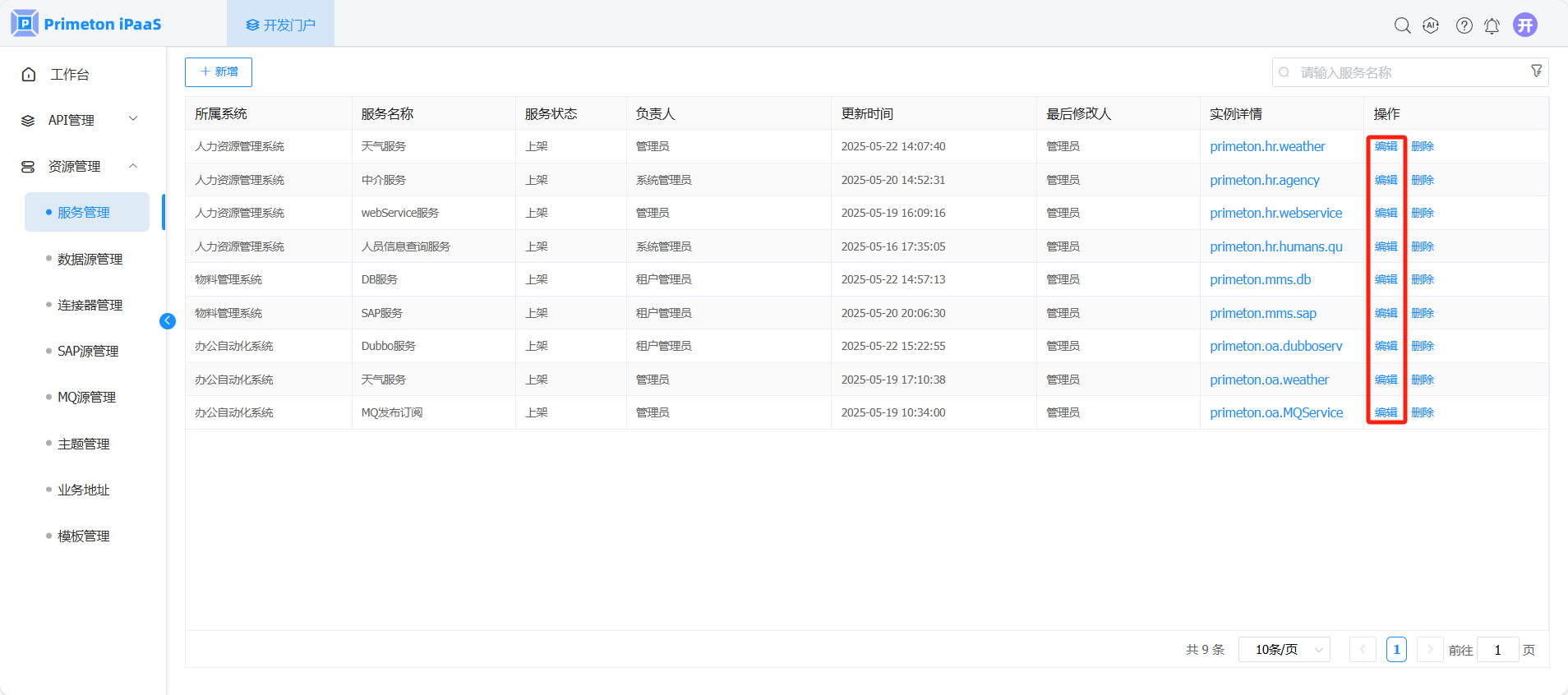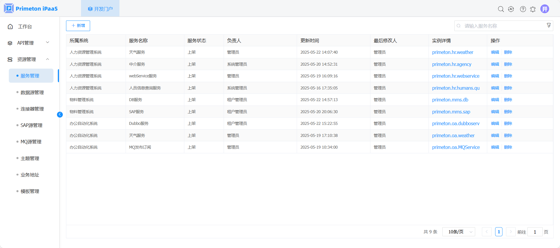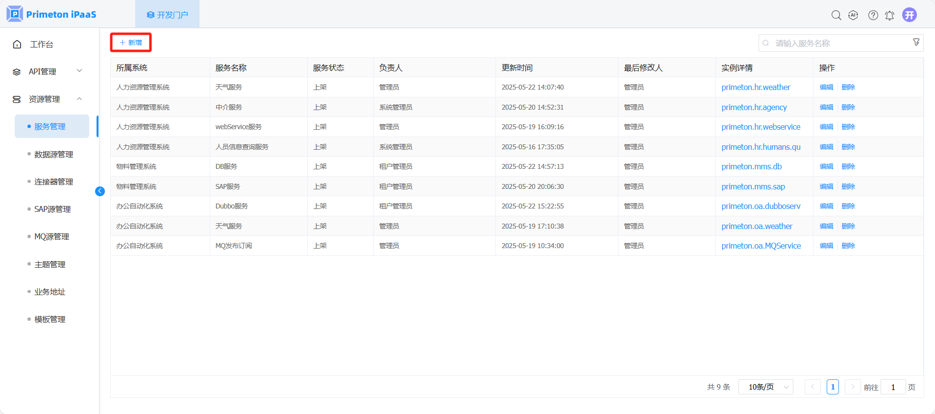 开发人员登录系统,进入开发门户,点击菜单“资源管理” > ”服务管理”,打开服务管理界面。