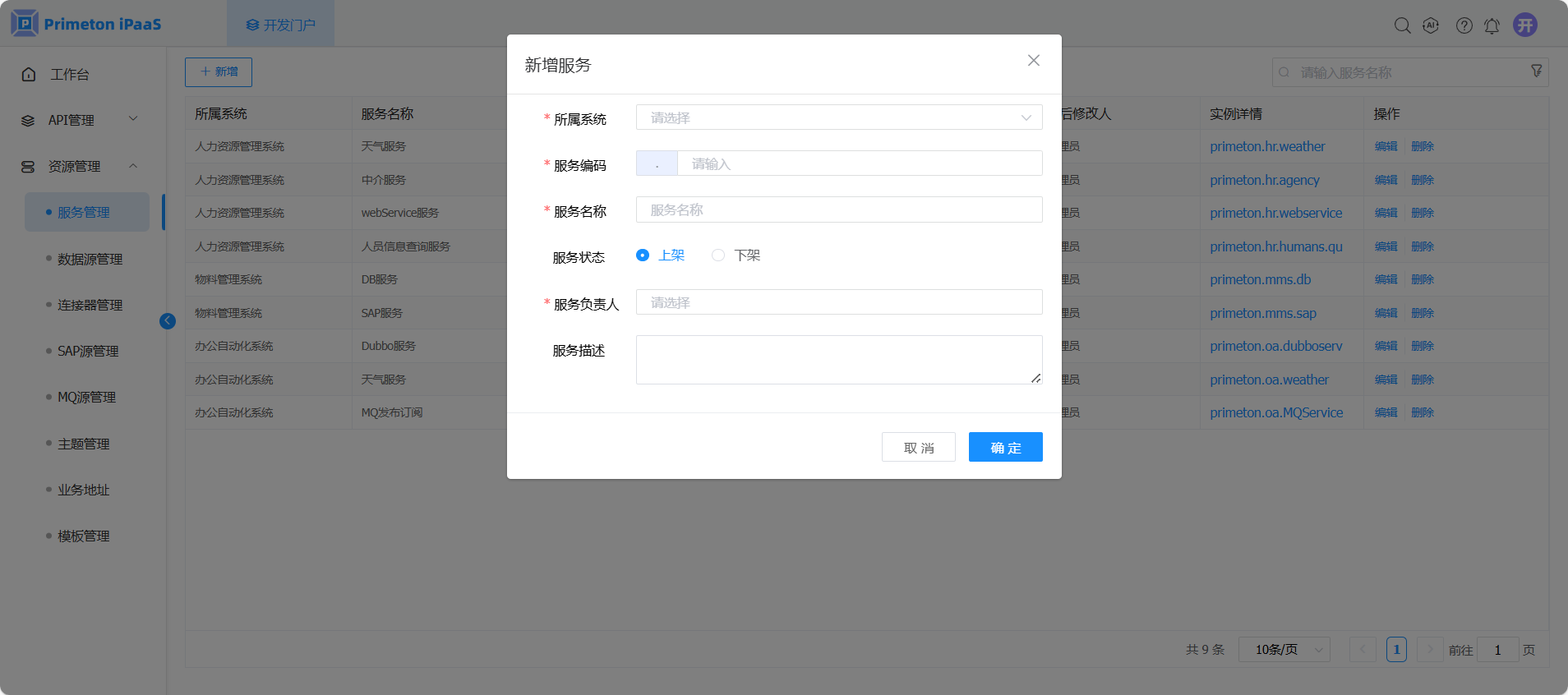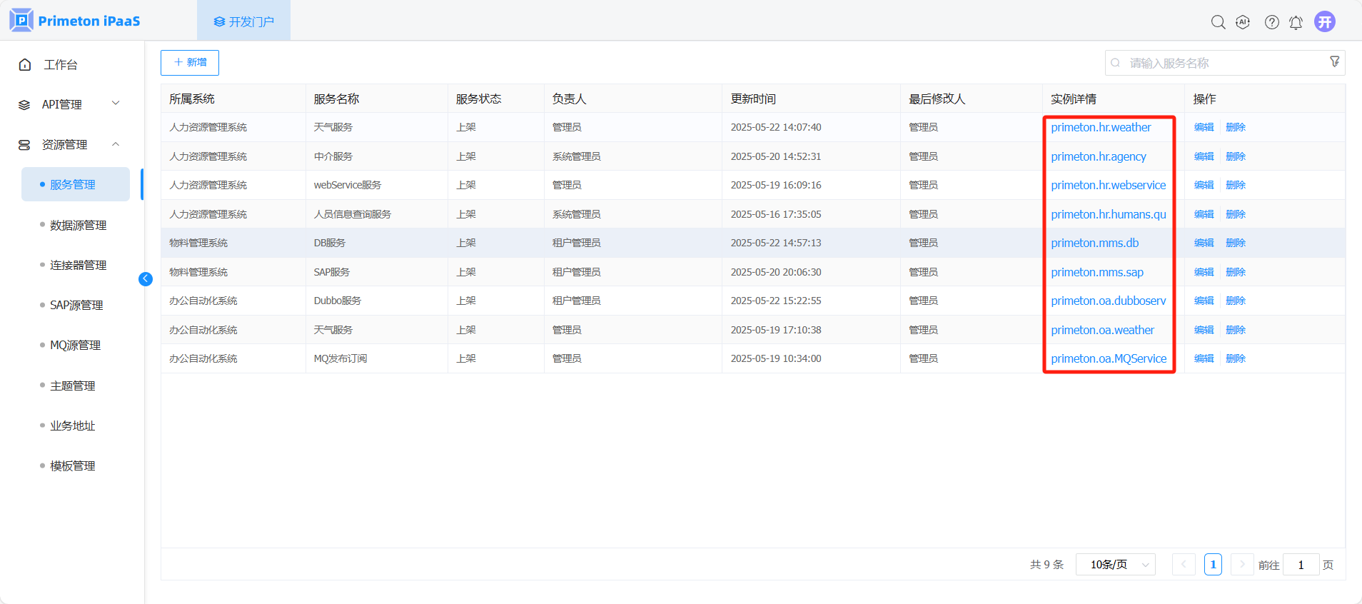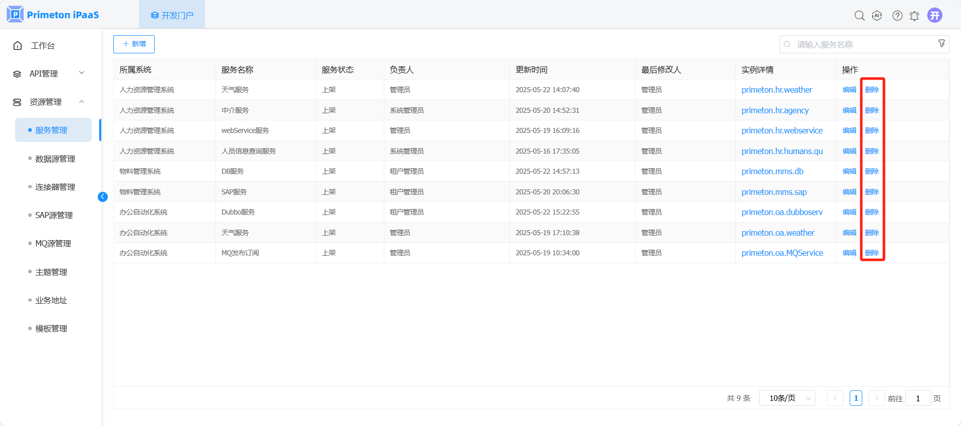 开发人员登录系统,进入开发门户,点击菜单“资源管理” > ”服务管理”,打开服务管理界面。