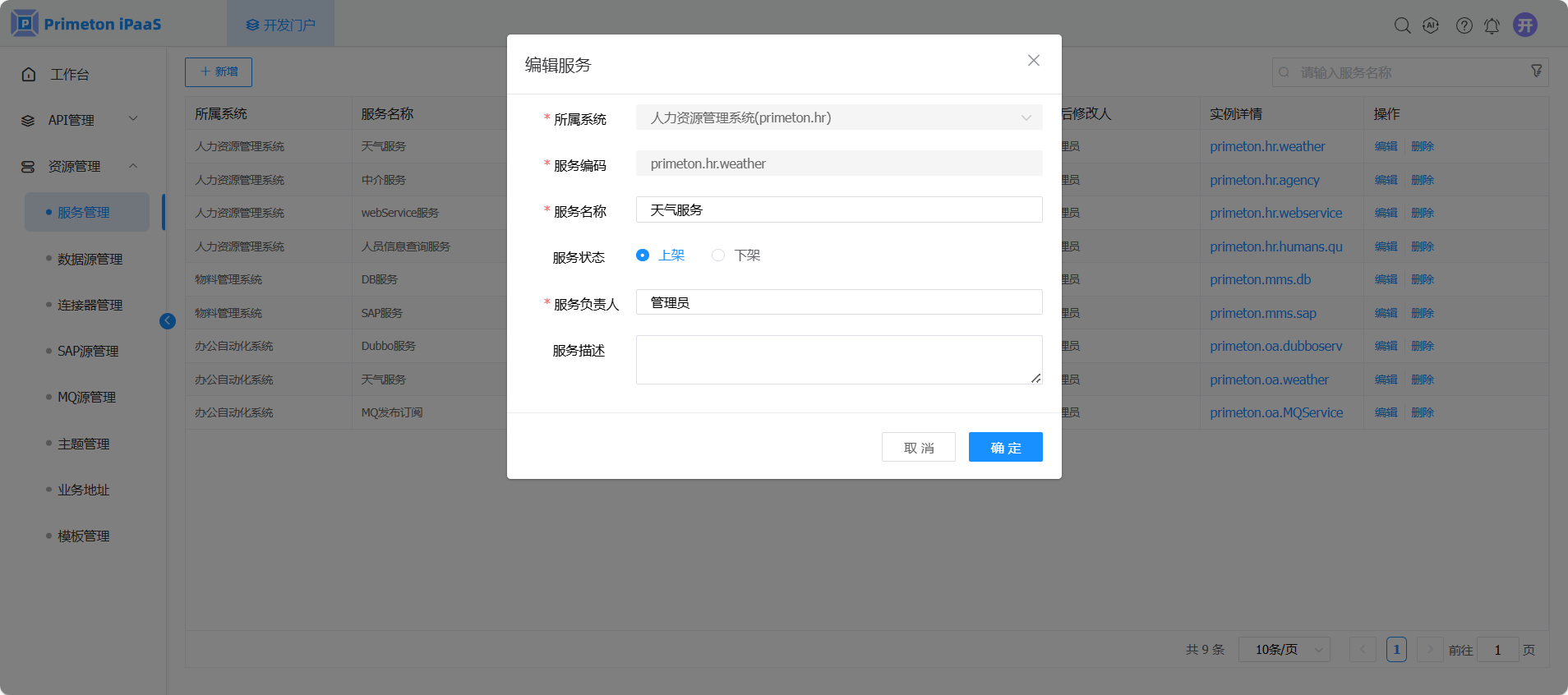 在服务管理页面,选择一个服务,在操作列点击“编辑”按钮,弹出编辑服务页面。
