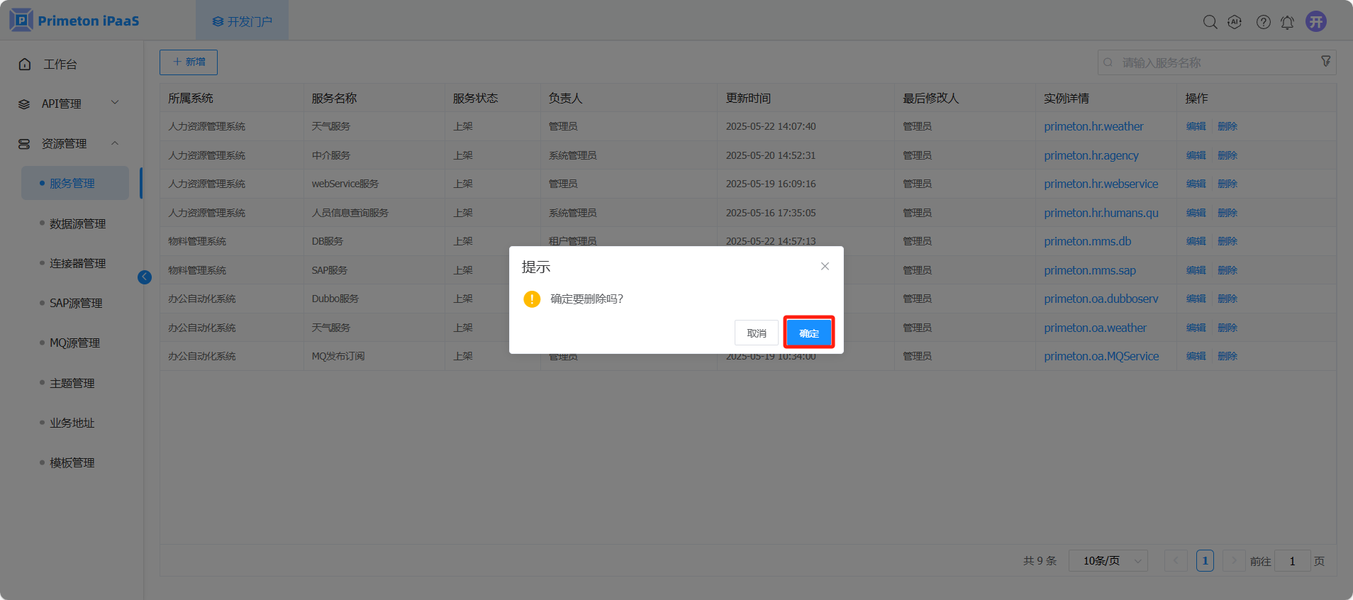 在服务管理页面,选择一条需要删除的服务记录,点击操作列“删除”按钮,弹出确认删除提示框。