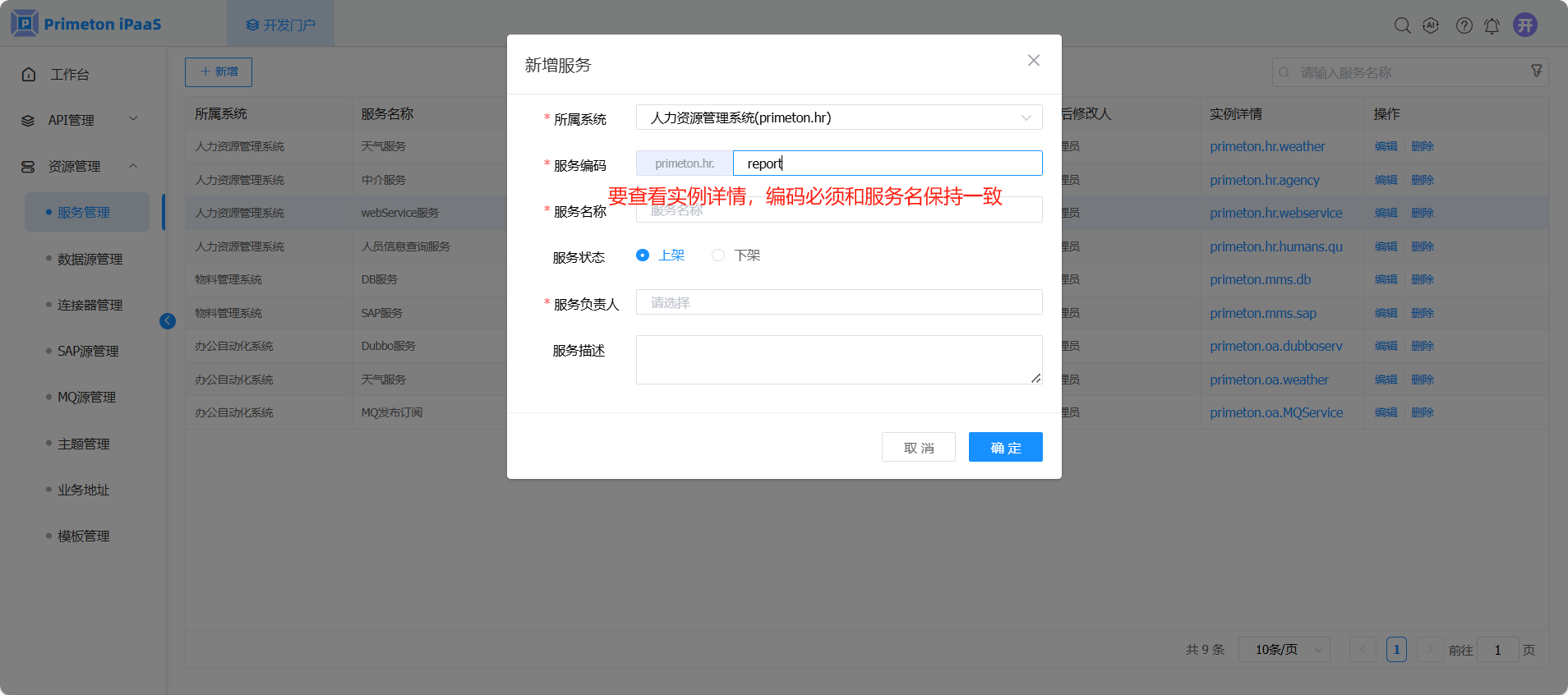 如果服务与Portal连接同一个nacos或eureka,新增服务时,服务编码必须与nacos的服务名保持一致