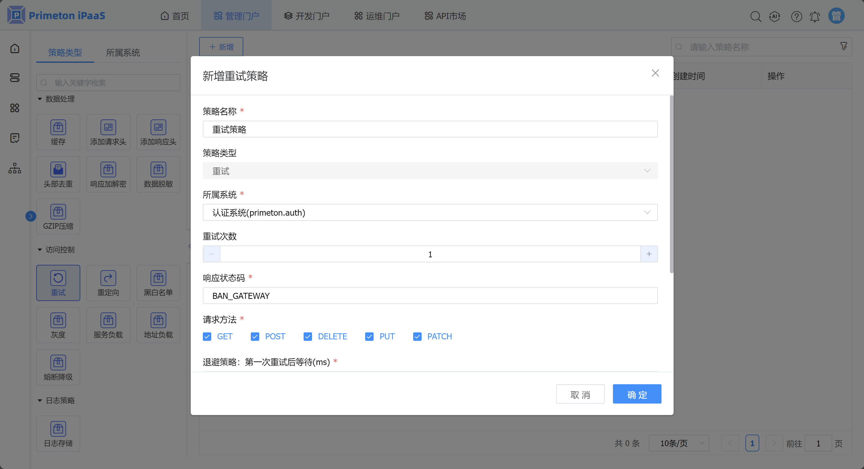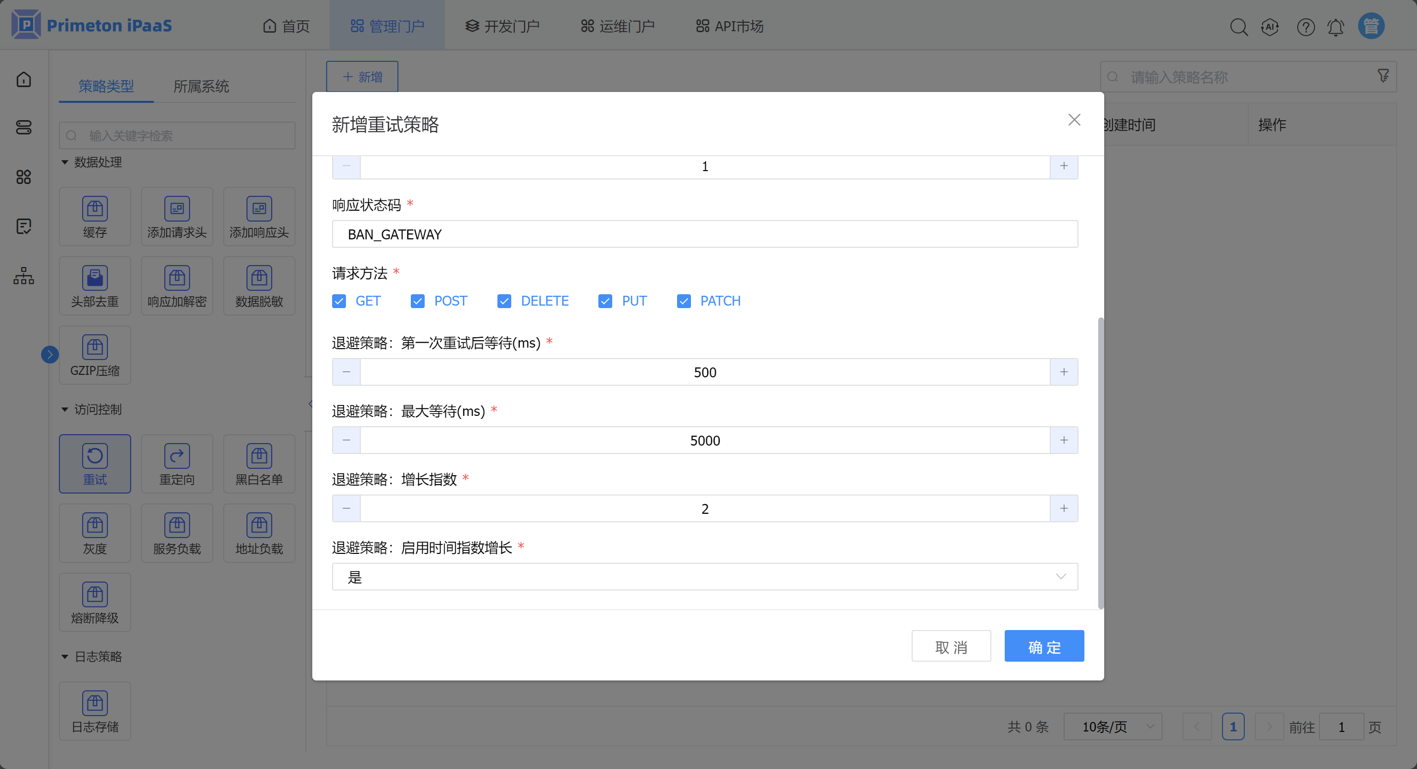 重试策略用于处理API调用失败的情况,例如服务端异常、网络问题等,可以配置重试次数、响应状态码、请求方法、退避策略等参数。