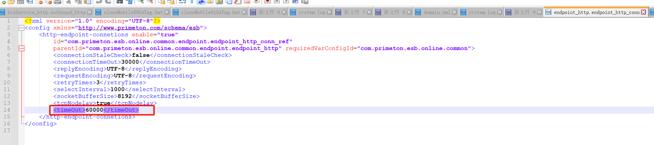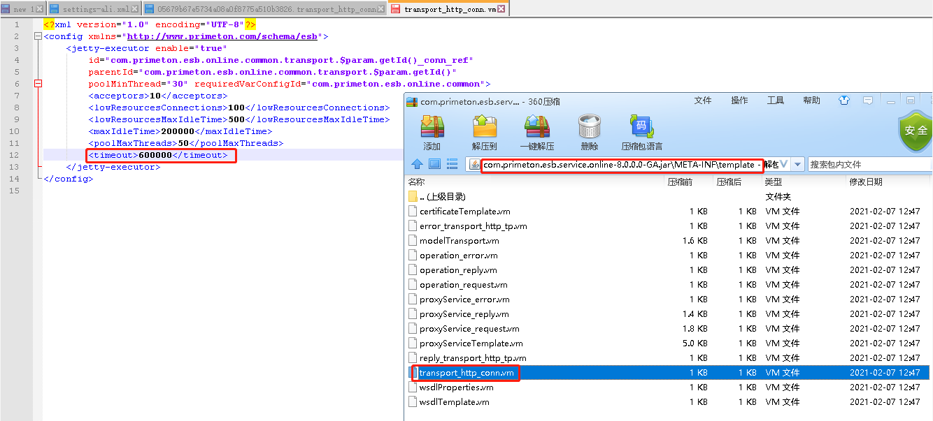 在{server安装目录}/server/plugins/com.primeton.esb.service.online-x.x-LA.jar/META-INF/template/transport_http_conn.vm中新增配置<timeout>600000</timeout>,超时时间根据业务实际超时情况修改。如下图: