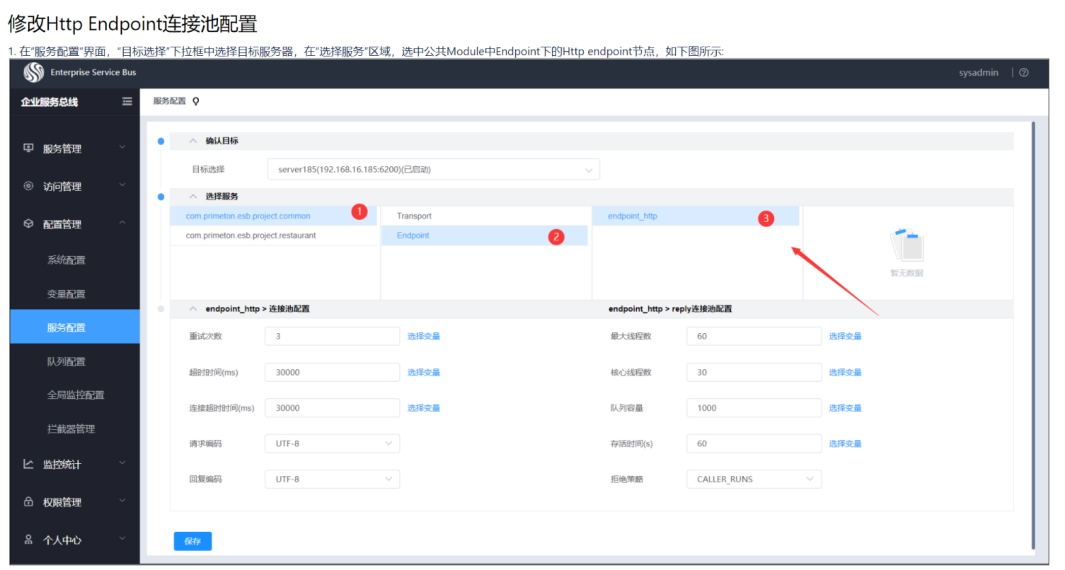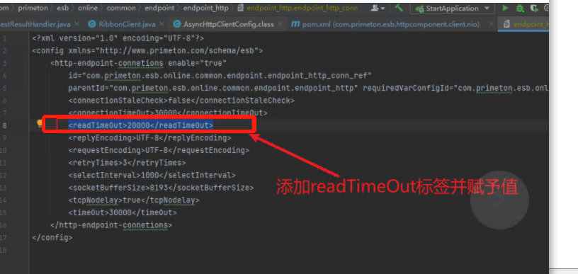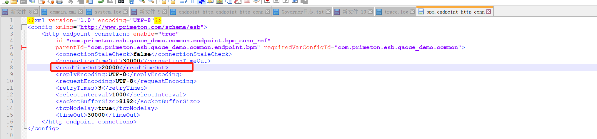 在线: 在/server/EOS/_srv/work/system/com.primeton.esb.online.common/com/primeton/esb/online/common/endpoint/endpoint_http/endpoint_http.endpoint_http_conn文件新增配置<readTimeOut>20000</readTimeOut>