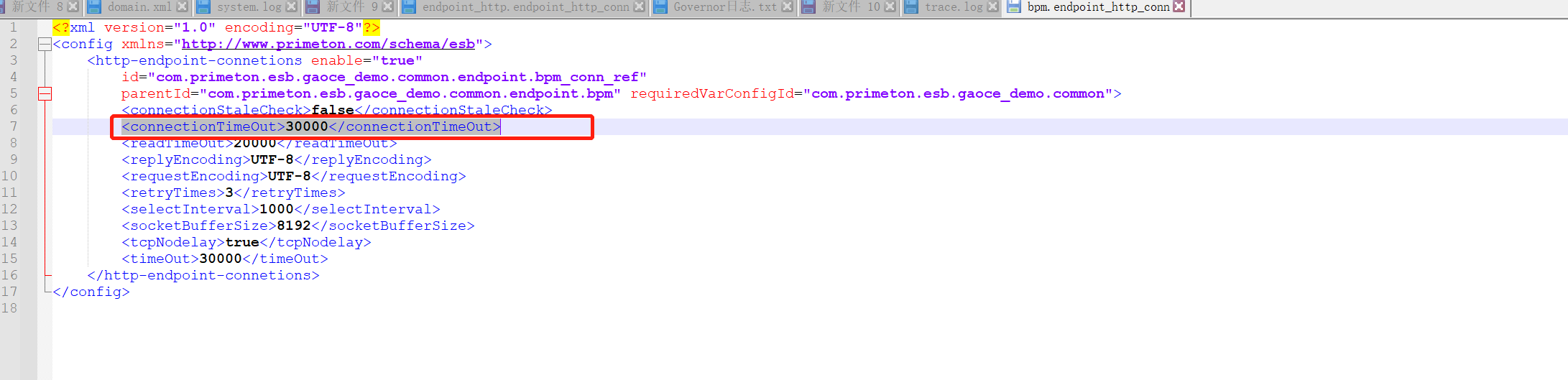 离线: 在/server/EOS/_srv/work/user/com.primeton.esb.xxx.common/com/primeton/esb/xxx/common/transport/transport_http/transport_http.transport_http_conn文件中timeout,增加配置<timeout>500000</timeout>